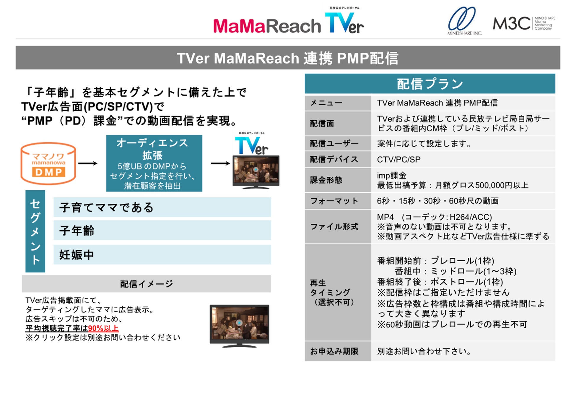 株式会社マインドシェア(本社:東京都港区、代表取締役:今井祥雅)は、自社が提供する子育て層特化型の広告配信システム「MaMaReach(ママリーチ)」の配信先として、新たに民放公式テレビ配信サービス「TVer(ティーバー)」と連携したことをお知らせいたします。これにより、TVer上でもお子さまの年齢・月齢に応じた精緻な広告配信が可能となり、広告の無駄打ちを減らすことで圧倒的に効率化します。