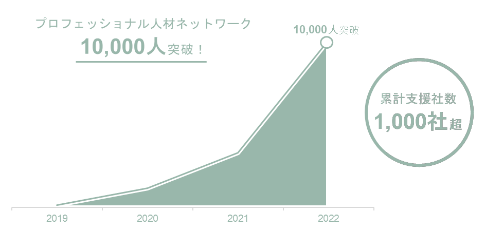 ベンチャー企業の資金調達額の拡大やIPO企業数の増加等成長産業の発展と共に、創業時から数多くの企業の支援実績を積み重ね、支援社数が累計1,000社、プロフェッショナル人材ネットワークが10,000人を突破しました。