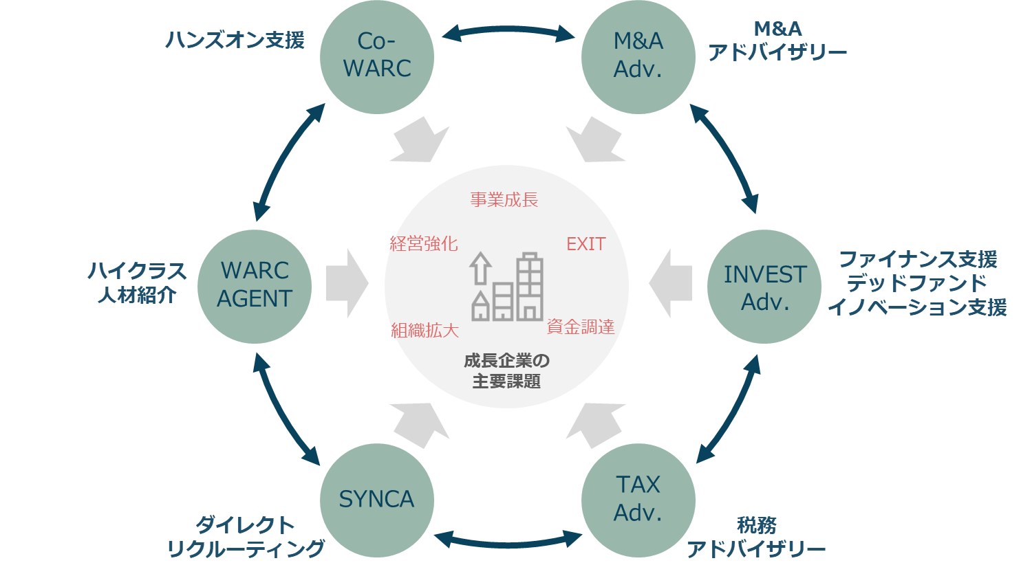 当社は「想いをカタチに出来る世の中を創る」というミッションを掲げ、2017年の創業以来、スタートアップから東証プライム上場企業まで成長企業の「攻めを守る」をスローガンとし、経営管理部門支援サービスとして、ハンズオン支援サービス・ハイクラス人材紹介「WARC AGENT」・管理部門特化のダイレクトリクルーティングサービス「SYNCA」を、ファイナンス支援サービスとして、資金調達支援サービス・M&Aアドバイザリーサービス等を展開しています。