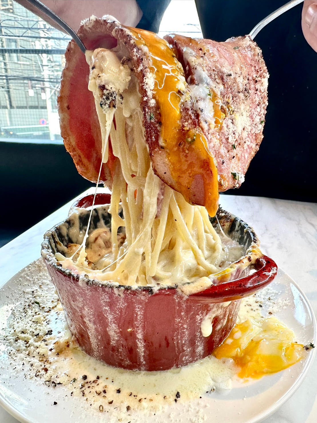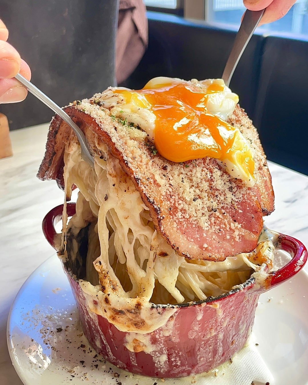 【流れるチーズとカルボナーラソースが溶岩みたい?】SNS映え必須…と話題沸騰中のカルボナーラ・ボルケーノパスタ(溶岩パスタ)とは?!