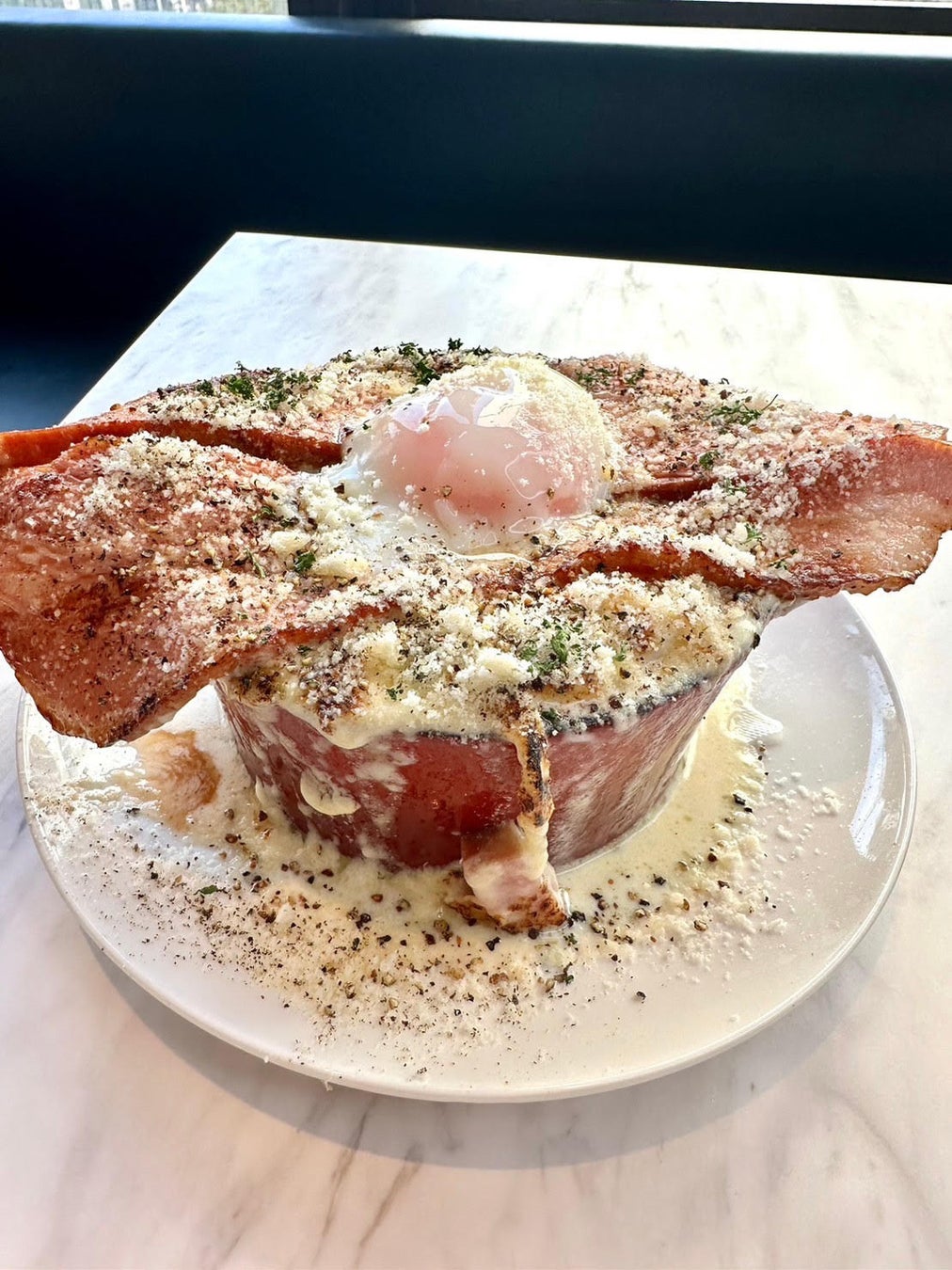 こんがり焼き色がついたチーズの上には、極厚なベーコンが2枚どーんと乗せたボリュームとインパクト満点なカルボナーラ・ボルケーノパスタ。