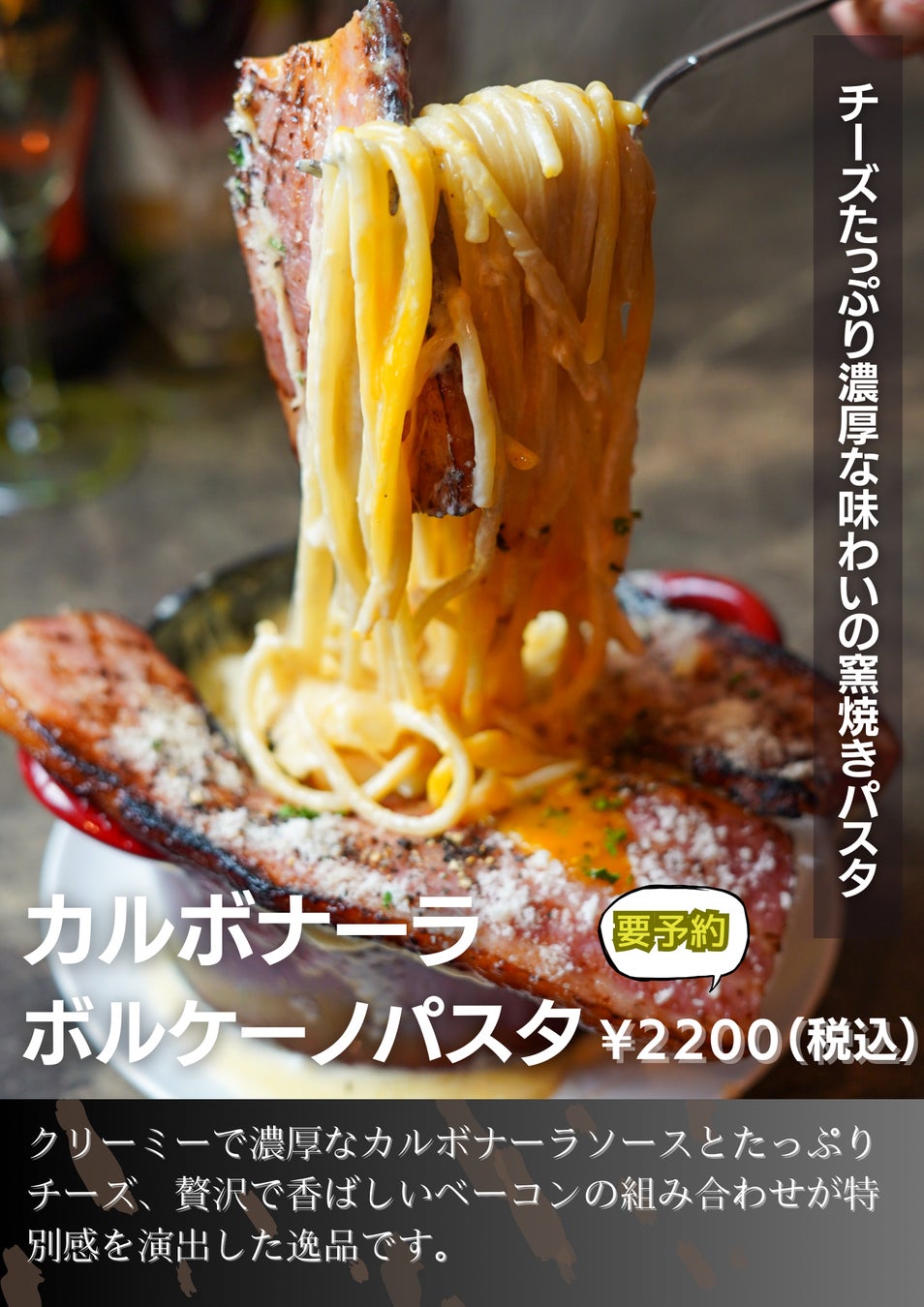 肉厚ベーコンを乗せたカルボナーラのボルケーノパスタもオススメ! |