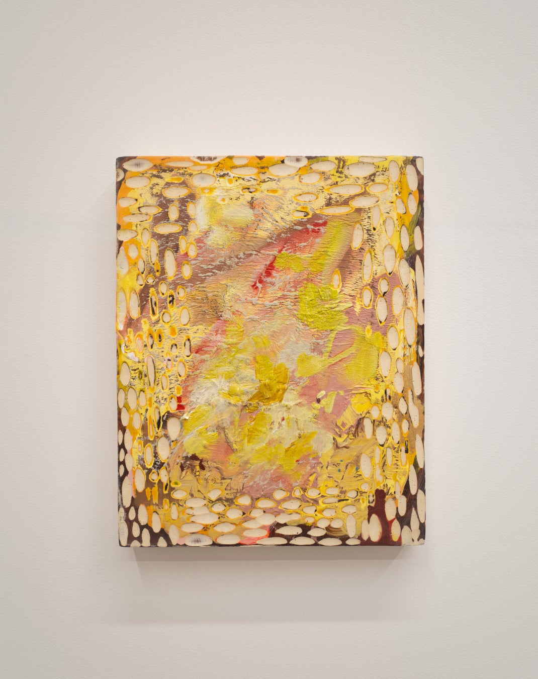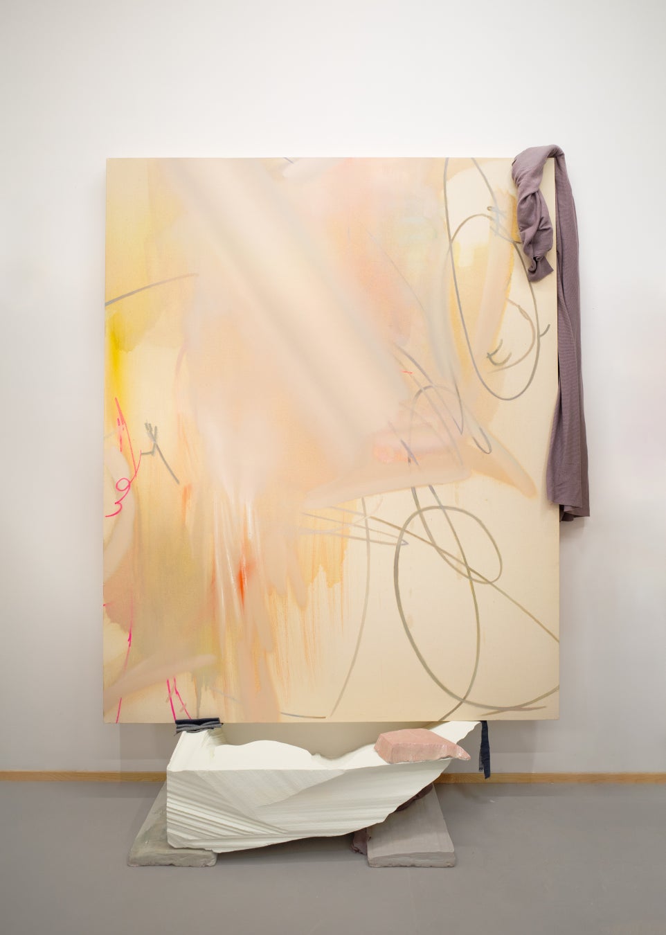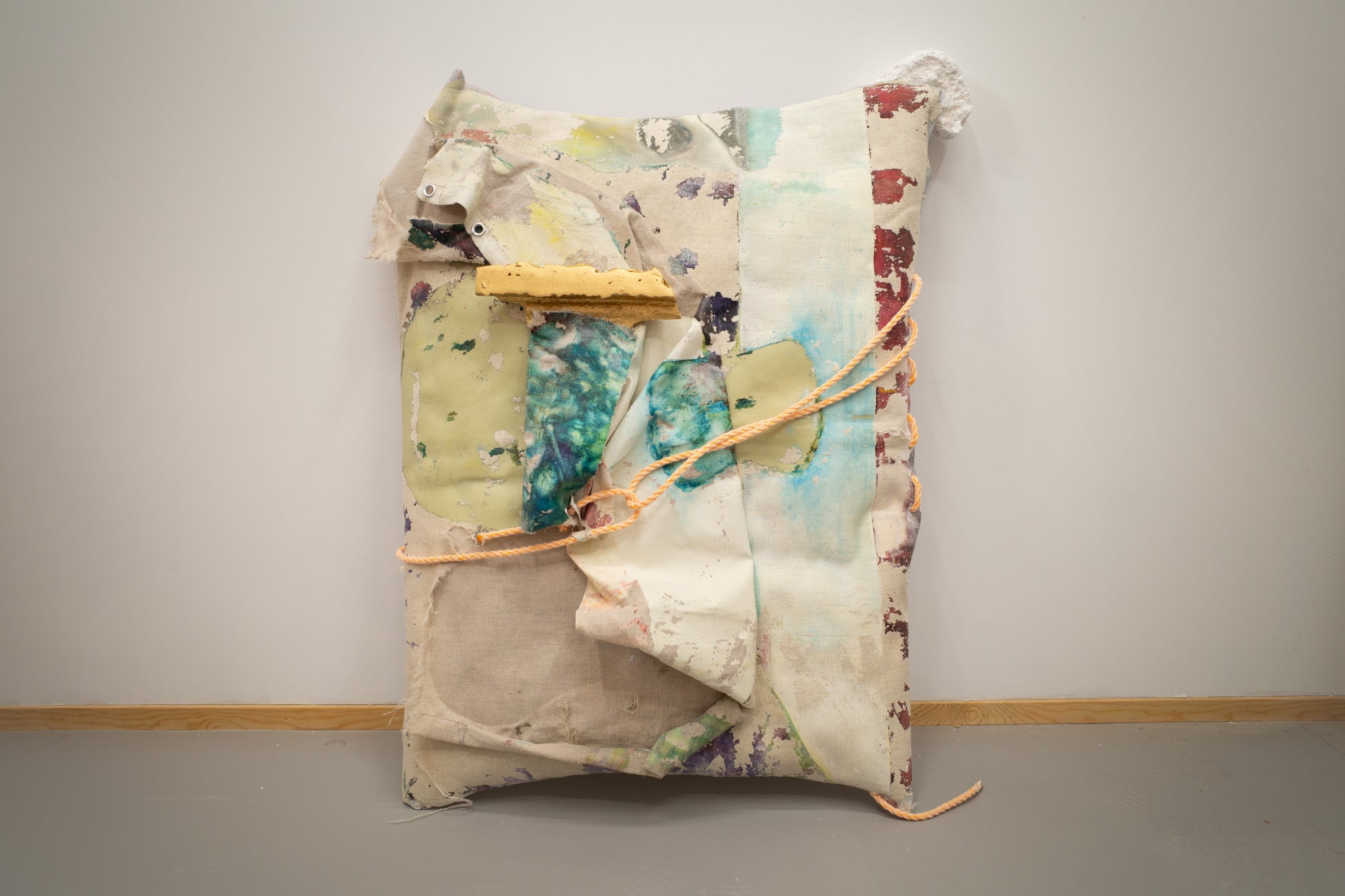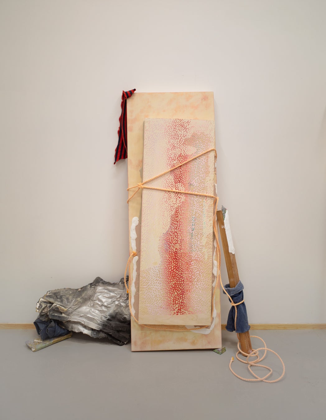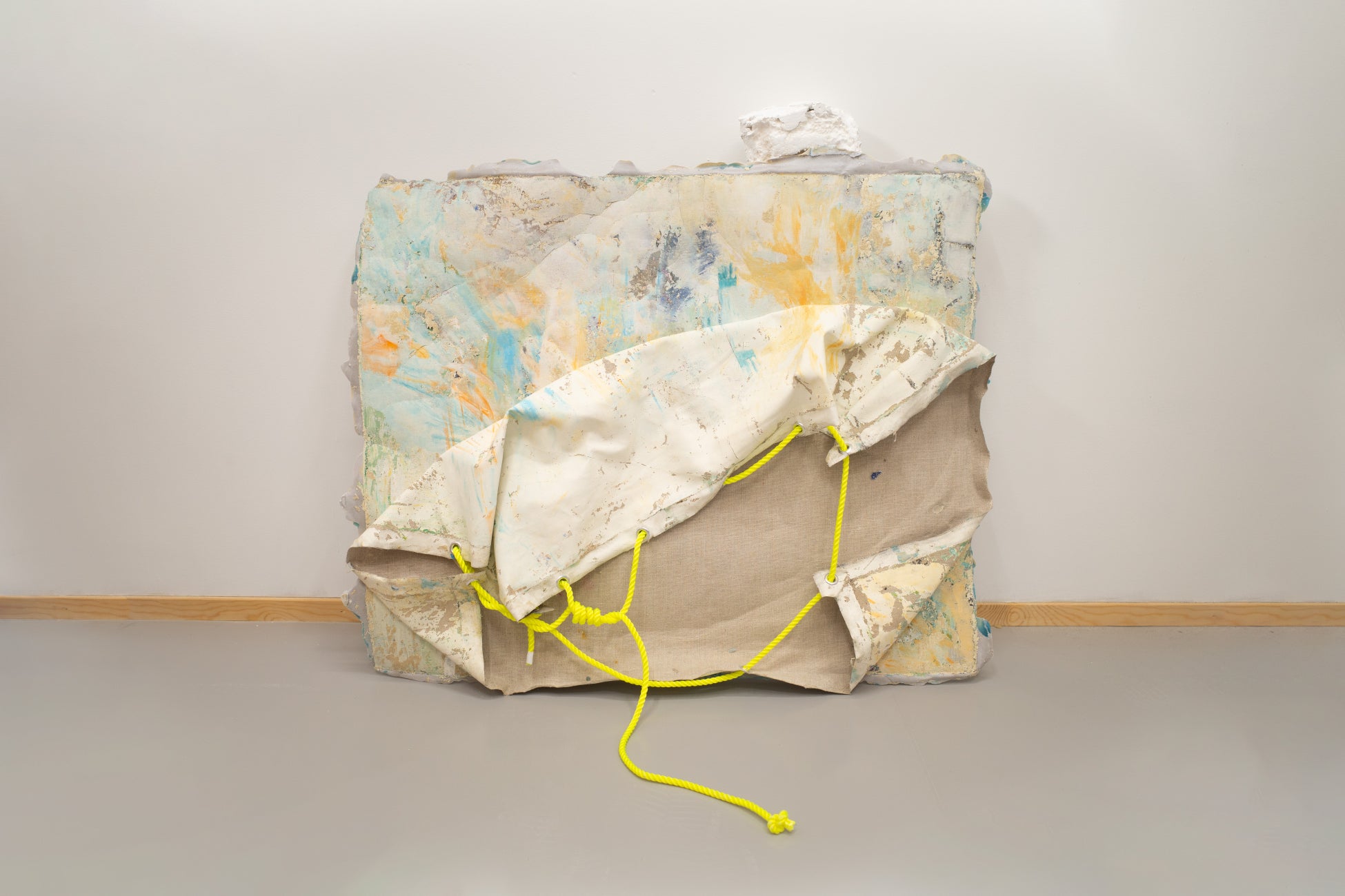 また、梱包材ないし支持体として用いられるロープや木箱、発泡スチロールなど、作品をとり巻く異質な素材が「アクセサリー」のように使用されることもあります。わずかなバランスの変化でも全体の印象は全く異なるものになるかも知れません。田岡は絵画を「コーディネート」することで、「絵になる」というのはどういうことなのかを探求しています。