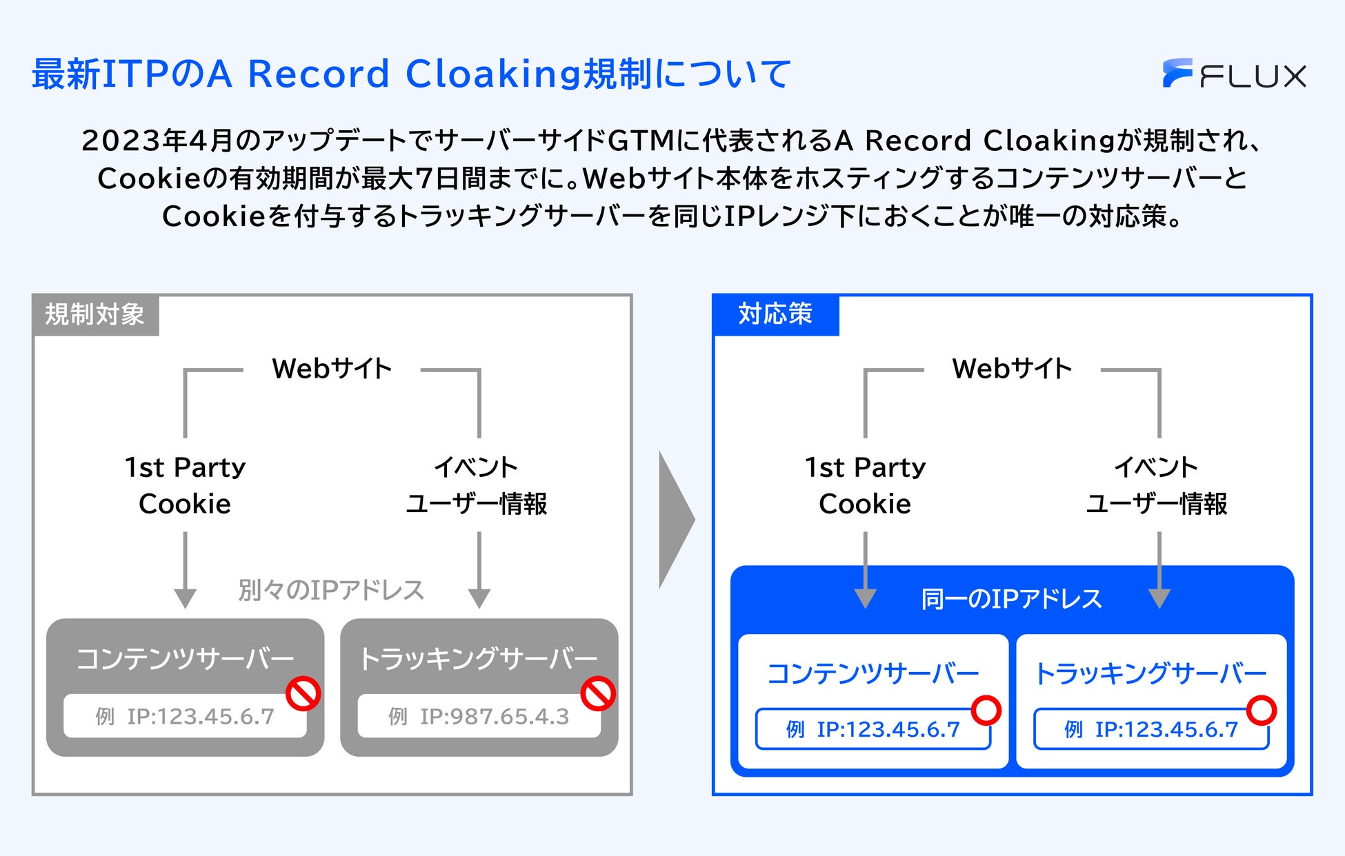 大きな変更点は、「Webサイトのサーバーと計測システムのサーバーのIPアドレスが異なる場合、1st Party Cookieの場合であっても保持期間が最大7日間」に規制され、これにより1st Party Cookieを活用した計測手法であるGTM(Google Tag Manager)のサーバーサイドタグ設定などが実装方法によっては新たな規制の対象となりました。