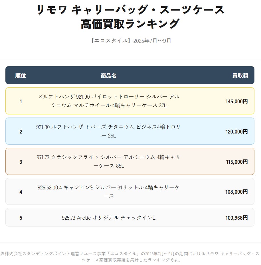 株式会社スタンディングポイント(本社:東京都目黒区、代表取締役:若森 寛)が運営するファッションリユース事業「ECOSTYLE(エコスタイル、https://www.style-eco.com/)」は、エコスタイルにおける2025年7月~9月のリモワ(RIMOWA)のモデル別買取ランキングを発表します。