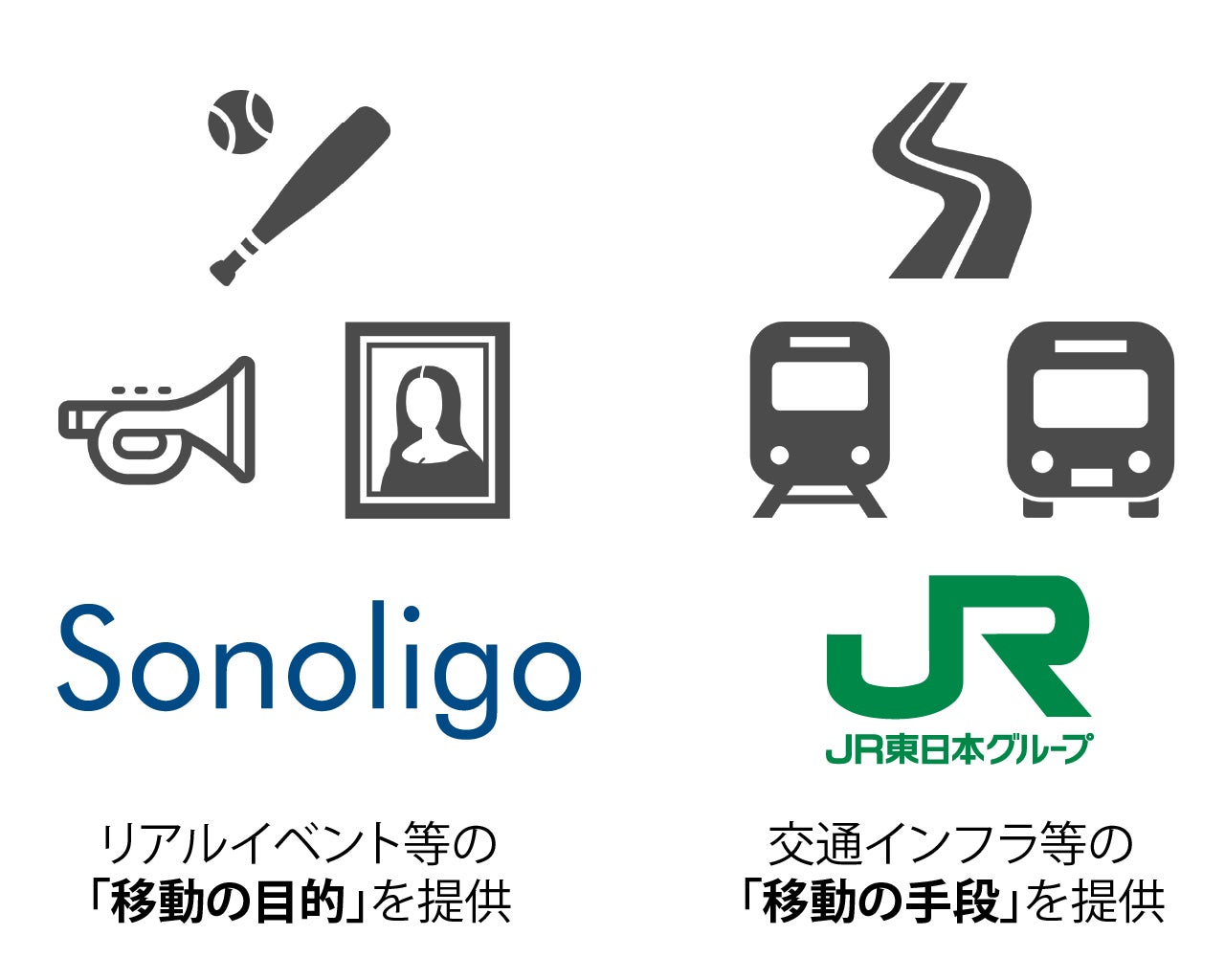 JR東日本が提供する鉄道ネットワークや駅ビルをはじめとした各種サービス利用するお客さまに、Sonoligoの提供する「文化イベント」をお楽しみ頂くことで「ヒトの移動」と「移動の目的」をスムーズに連携させ、お客さまに「新たな文化体験」を提供し、より充実したライフスタイルを提案いたします。