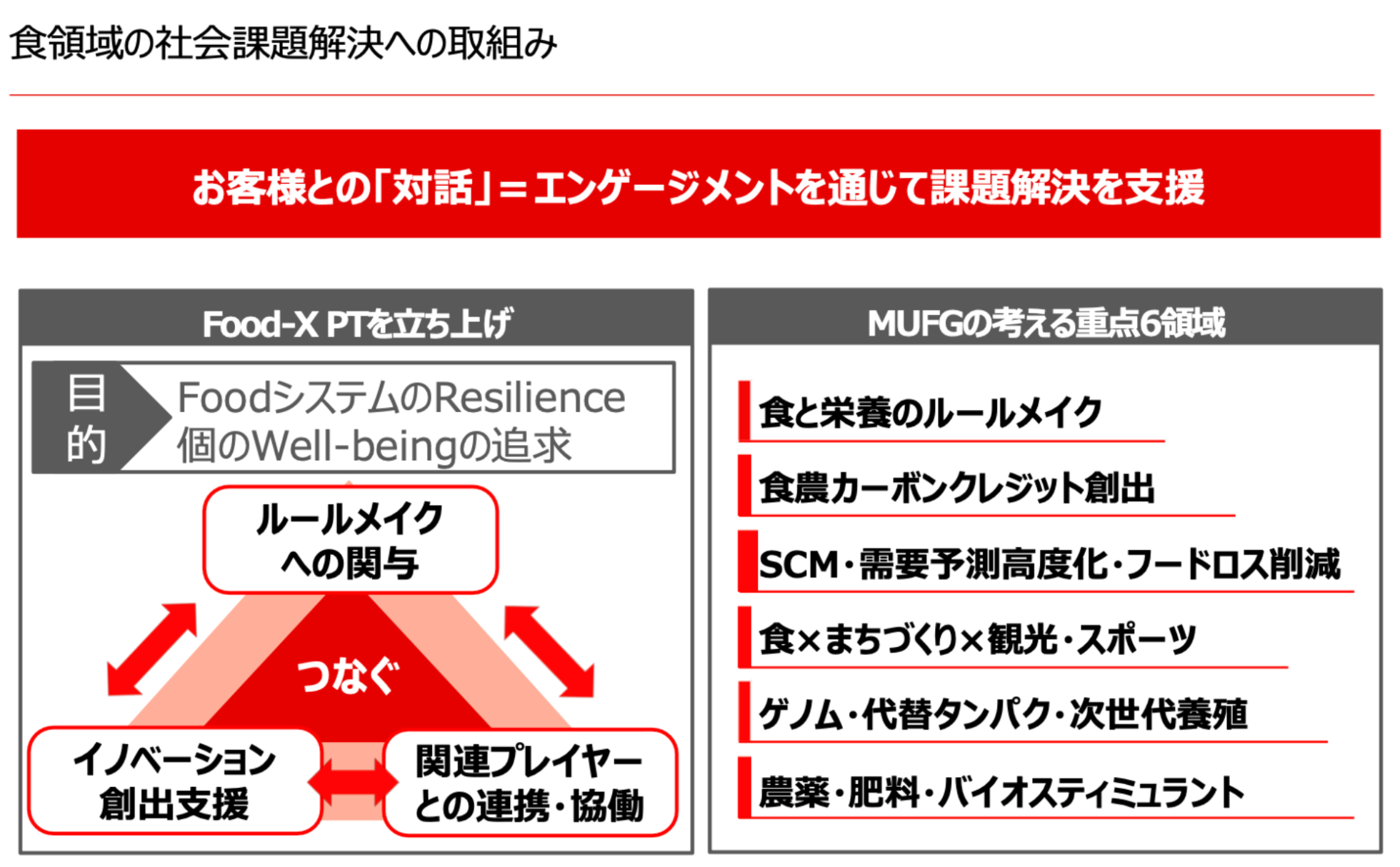 三菱UFJ銀行においては、食領域の社会課題解決への取り組みとして「Food-X PT」という部署横断のプロジェクトを立ち上げ、その重点領域のひとつに「農薬・肥料・バイオスティミュラント」が含まれます。日本の農業を取り巻く課題に、温室効果ガスの排出や担い手の高齢化などが挙げられるなかで、持続可能な農業の必要性が高まっており、それに対して金融機関としても課題解決のお手伝いをする必要があると考えています。課題解決の一つの手法として、農業系カーボンクレジットは有力な手段とみております。「化学肥料を減らす」「土壌中の炭素を増やす」「土壌から排出されるメタンを減らす」という3つの温室効果ガス削減のアプローチがあり、三菱UFJ銀行としても枠組みづくりを農林水産省・メーカー・生産者側とも連携しながらサポートして参りたいと考えています。