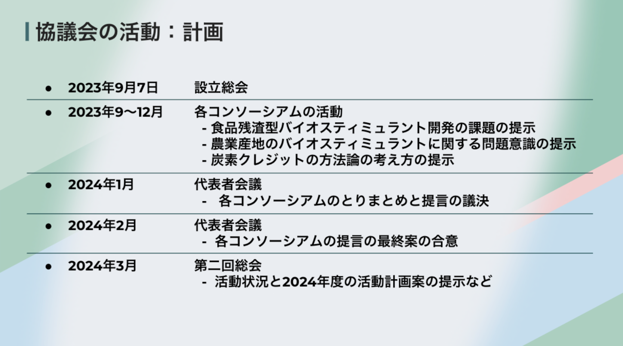 食品残渣バイオスティミュラントコンソーシアムよりJAきたみらい 代表理事組合長 大坪氏、バイオスティミュラント栽培検証コンソーシアムよりJAはが野 代表理事組合長 国府田氏、炭素クレジットコンソーシアムよりJAとぴあ浜松 常務理事 齊藤氏から今後の活動予定の報告をいただきました。