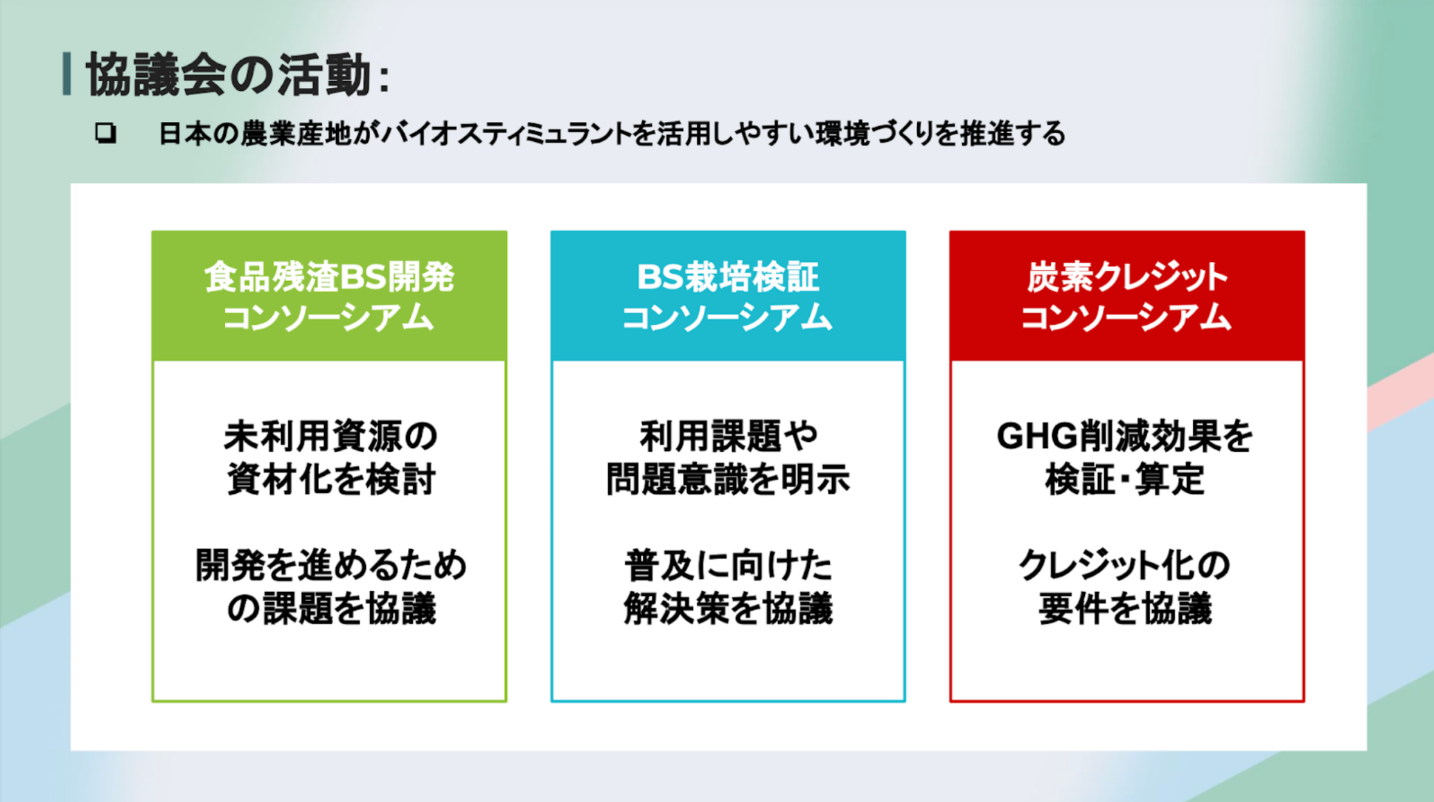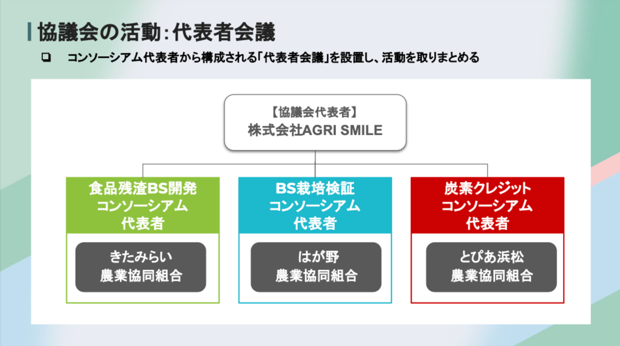 最後に、Eco-LABは独立した3つのコンソーシアムから成り立っていることに触れ、各地域のJAがその代表を務めていることを紹介しました。
