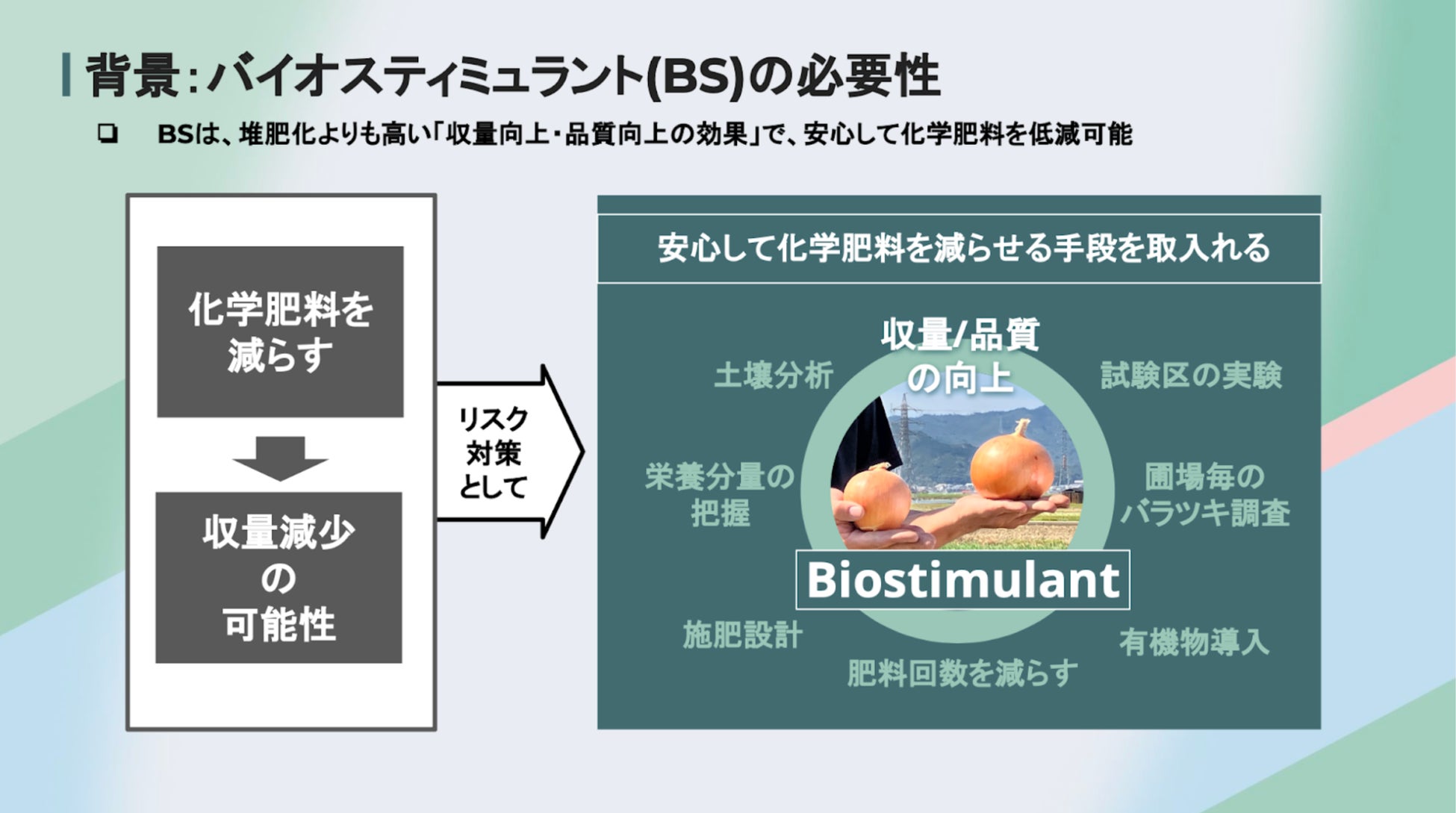 バイオスティミュラントは、政府の地球温暖化対策『GX戦略・みどりの食料システム戦略』にも掲げられている農業生産資材であり、植物本来の機能を引き出すことで環境ストレスを緩和させる特長を持ち、収量や品質の向上効果で注目されている新しい農業資材です。収量や品質の効果が見込めるため、化学肥料の使用量低減を実現する手段として期待されています。このうち、食品残渣を原料として開発されたバイオスティミュラントは、フードサプライチェーンの食品廃棄問題を解決しながら、農業生産量の拡大や化学肥料の使用量低減に寄与できるため、脱炭素社会の実現と、環境保全型農業の実現が両立できる画期的な生産技術です。