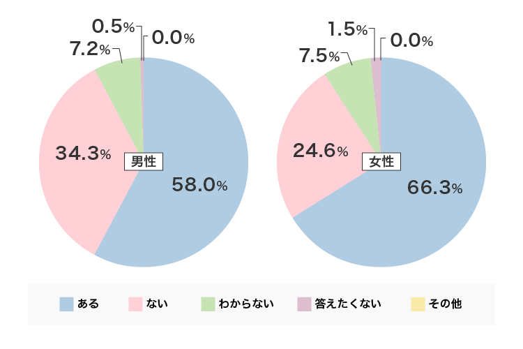 年代別で見ると、あまり大きな違いは見られませんでした。あえて違いを探すとわからないとの答えが、男女とも40代で突出しています。