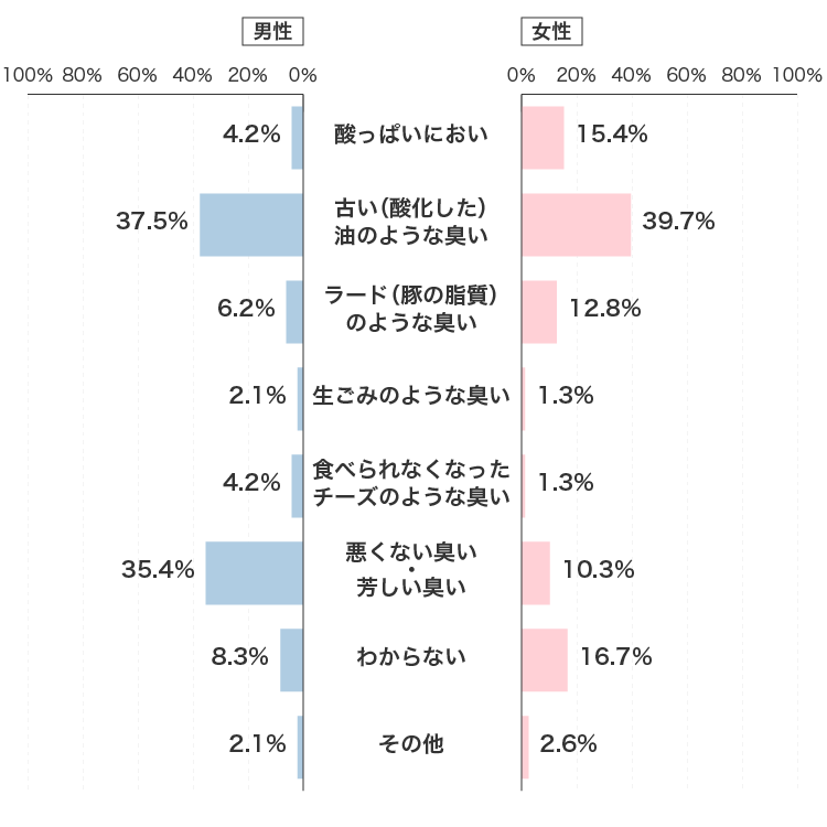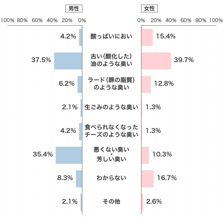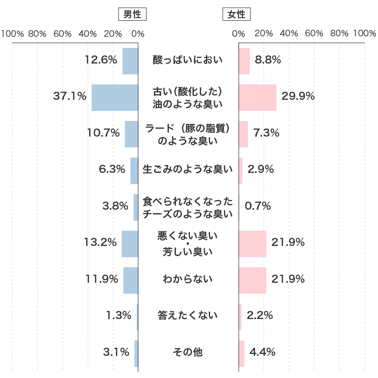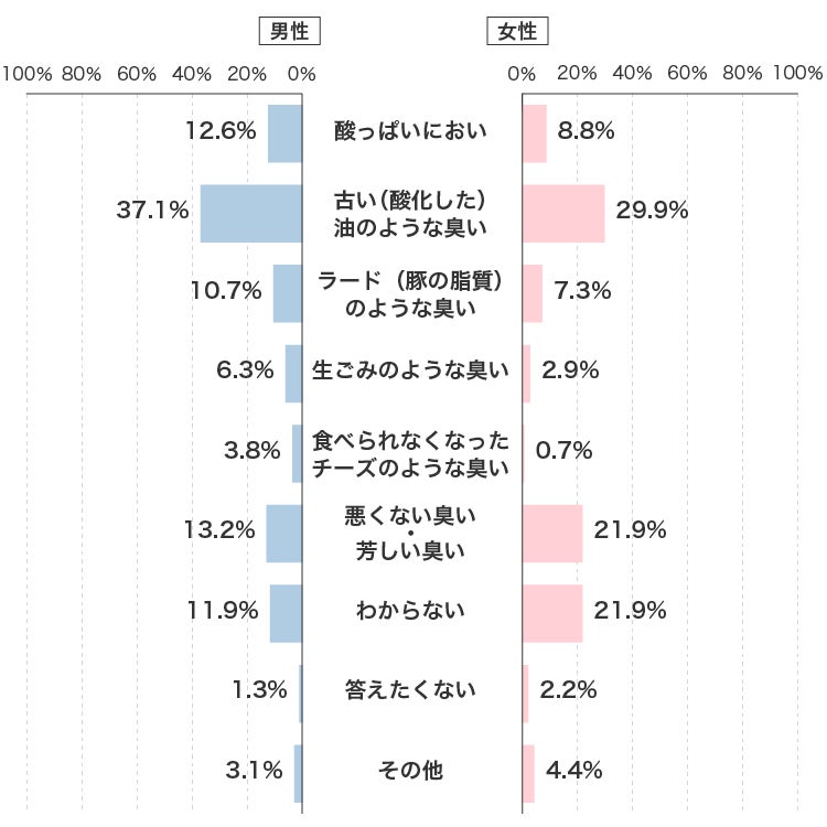 自身のニオイは、古い油のような臭い。女性の5人1人は悪くない、芳しい臭いと回答