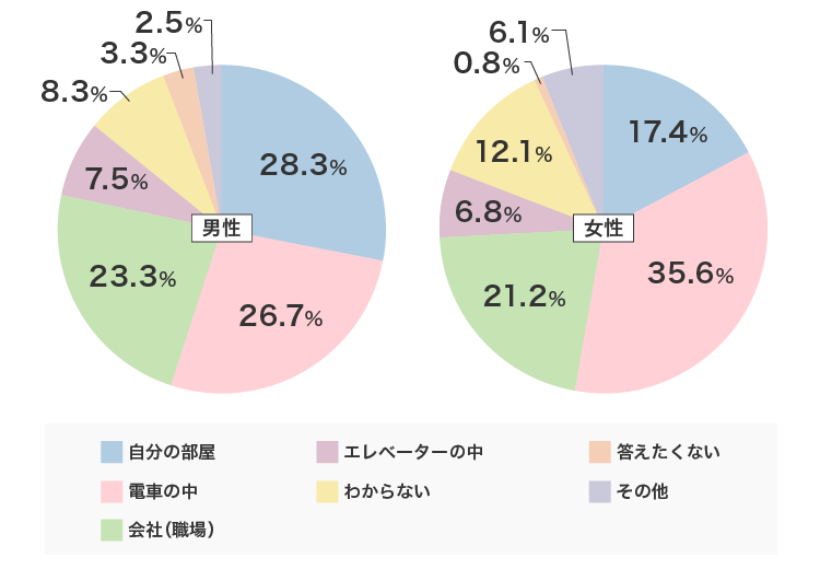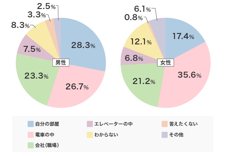 年代別で見ると、自分の部屋でと答えた男性が30代と50代で3倍近くあるのが目立ちました。もしかしたらリモートワーク等の影響かもしれません。