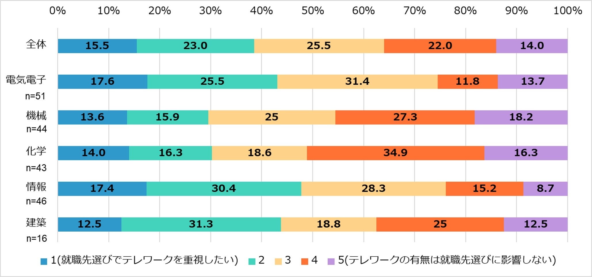 学科別では情報、建築、電気電子でテレワークを重視する学生が多く、化学、機械の学生ではテレワークの有無は就職先選びに影響しないとした学生が多かった。設備や機材の関係からそもそもテレワークがしにくい業務が多くありがちな化学、機械の学生ではテレワークを重視する意向が少ないことが推察される。