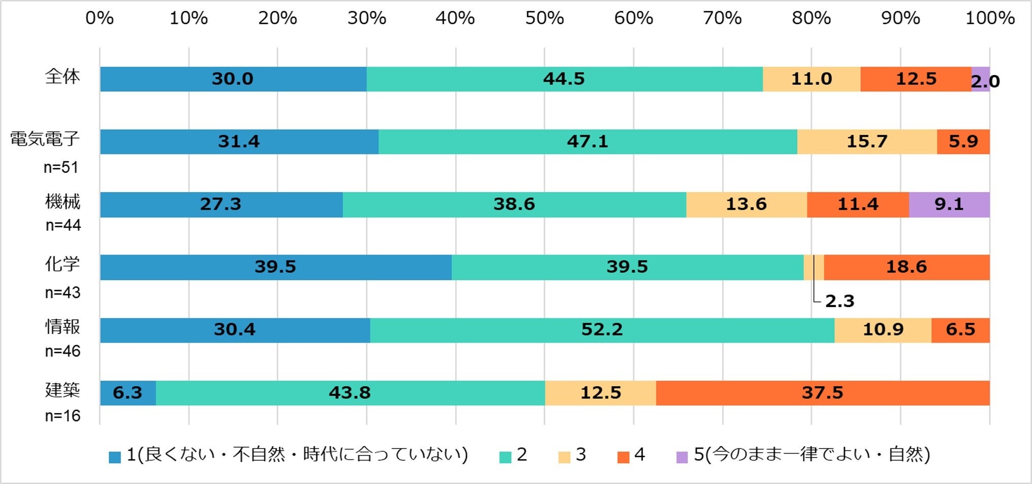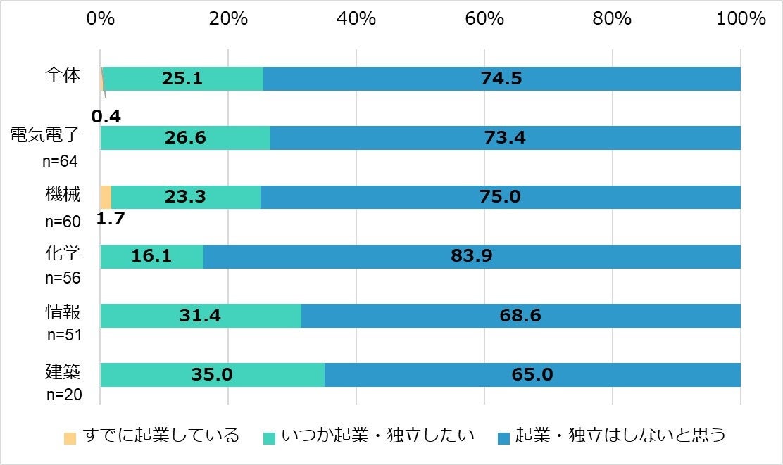 学科別にみると、「いつか起業・独立したい」と回答する学生は建築、情報の学生に多く、化学、機械の学生では少なかった。テレワークという働き方と同様に、規模の大きい生産設備や研究施設などが必要となる化学、機械の学生では起業・独立はしづらく、選択肢となりにくいのではないかと考えられる。