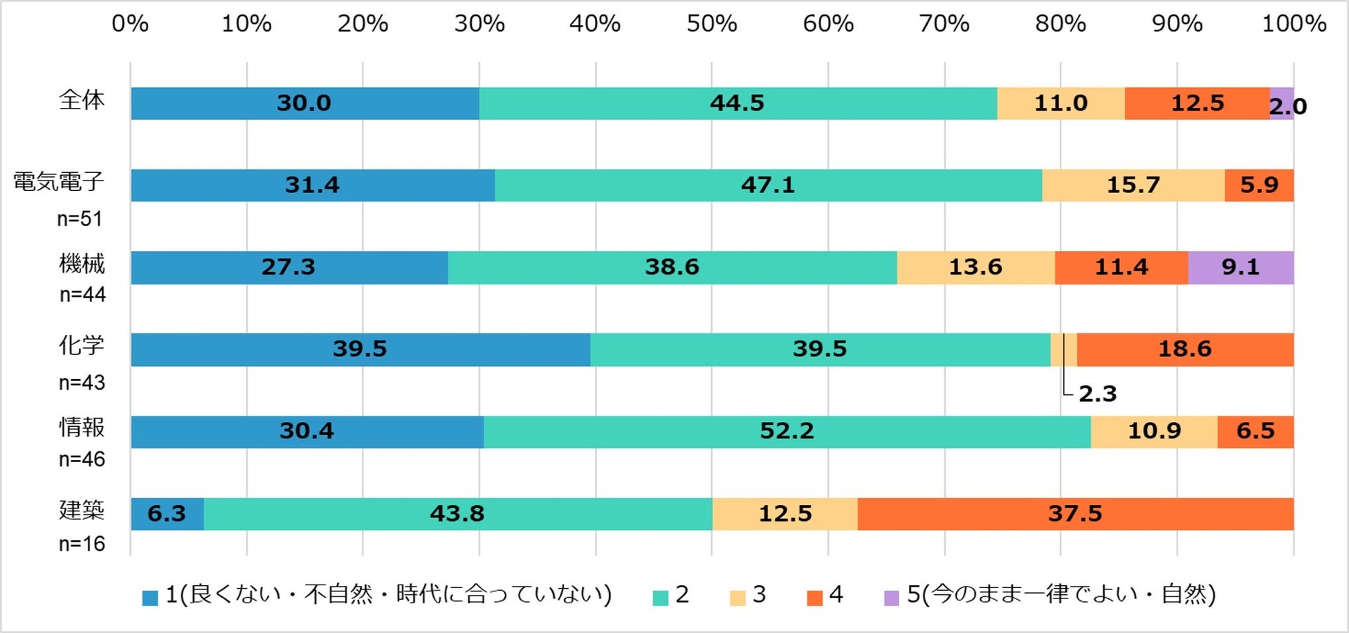 テレワークや起業・独立に関しては、学生が就職を希望する業種や職種、やりたい仕事によって向き・不向きがありますが、一定数の理系学生がテレワークを重視し、起業・独立志向があることが分かりました。また、初任給が文理共通で、職種や仕事の難易度に関係のない世の中に違和感を覚える理系学生が7割を超え、時代の変化を感じます。