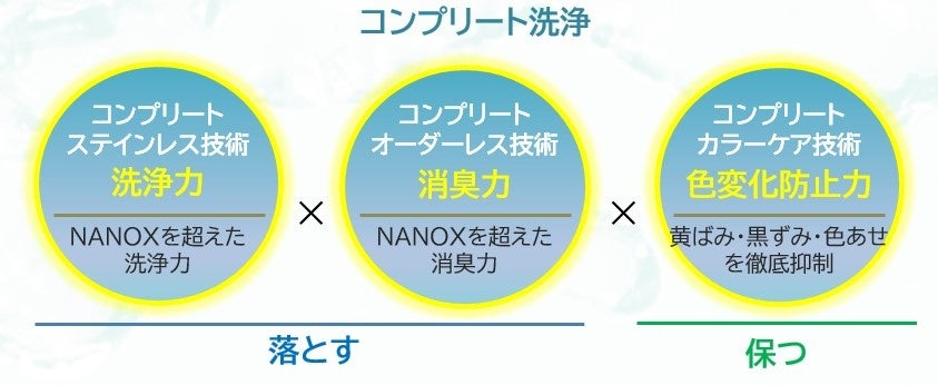 『NANOX one』は、「洗浄力」「消臭力」「色変化防止力」の性能を最大化するべく、当社が有する最新の技術を採用しました。この3つの技術全体を総称して「コンプリート洗浄」としています。