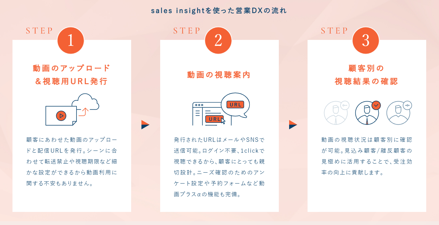 「sales insight」は、配信パフォーマンスの可視化が可能な営業特化型の動画配信ソリューションです。セールス動画の配信に加え、顧客別の視聴状況確認、情報流出を防ぐための視聴制限、アンケート機能など充実した機能を実装し、営業活動の効率化と顧客エンゲージメントの強化が同時に達成できます。
