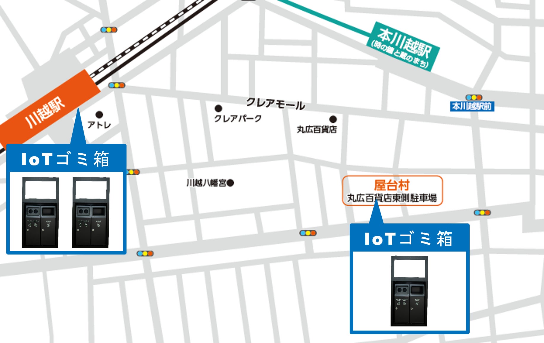 今回の検証ではWEB機能の検証は行わずに、ゴミ箱本体の機能検証を中心に実施します。計3台のIoTゴミ箱を設置し、ごみの排出量などの調査、およびゴミ箱に搭載する諸機能の検証を行うと共に、川越市での広告価値の検証などを行います。