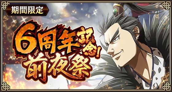 『キングダム 乱 -天下統一への道-』では日頃からキンランを遊んでいただいているお客様のお陰様で2月22日 (木)に6周年を迎える予定のため、感謝の意を込めて2月7日(水)20:30より、6周年前夜祭イベントを開催中です!
