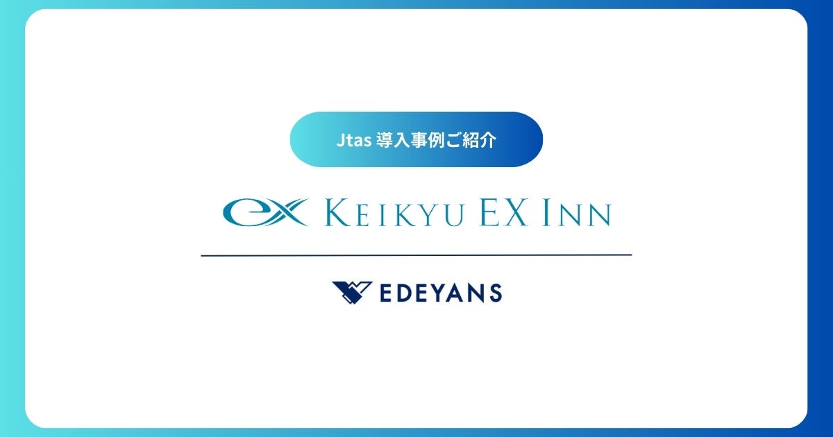 株式会社Edeyans(東京本社:東京都中央区、大阪本社:大阪市中央区、代表取締役社長:片山 裕之、以下「Edeyans」)と株式会社京急イーエックスイン(神奈川県横浜市、取締役社長:染崎 素洋、以下、「京急イーエックスイン」)は、忘れ物管理に関する業務の効率化を目的として、ハウスキーピング・オペレーティング・システム(HOS) 「Jtas -ジェイタス-」(以下、「Jtas」)の導入に係る包括契約を締結しましたことをお知らせします。