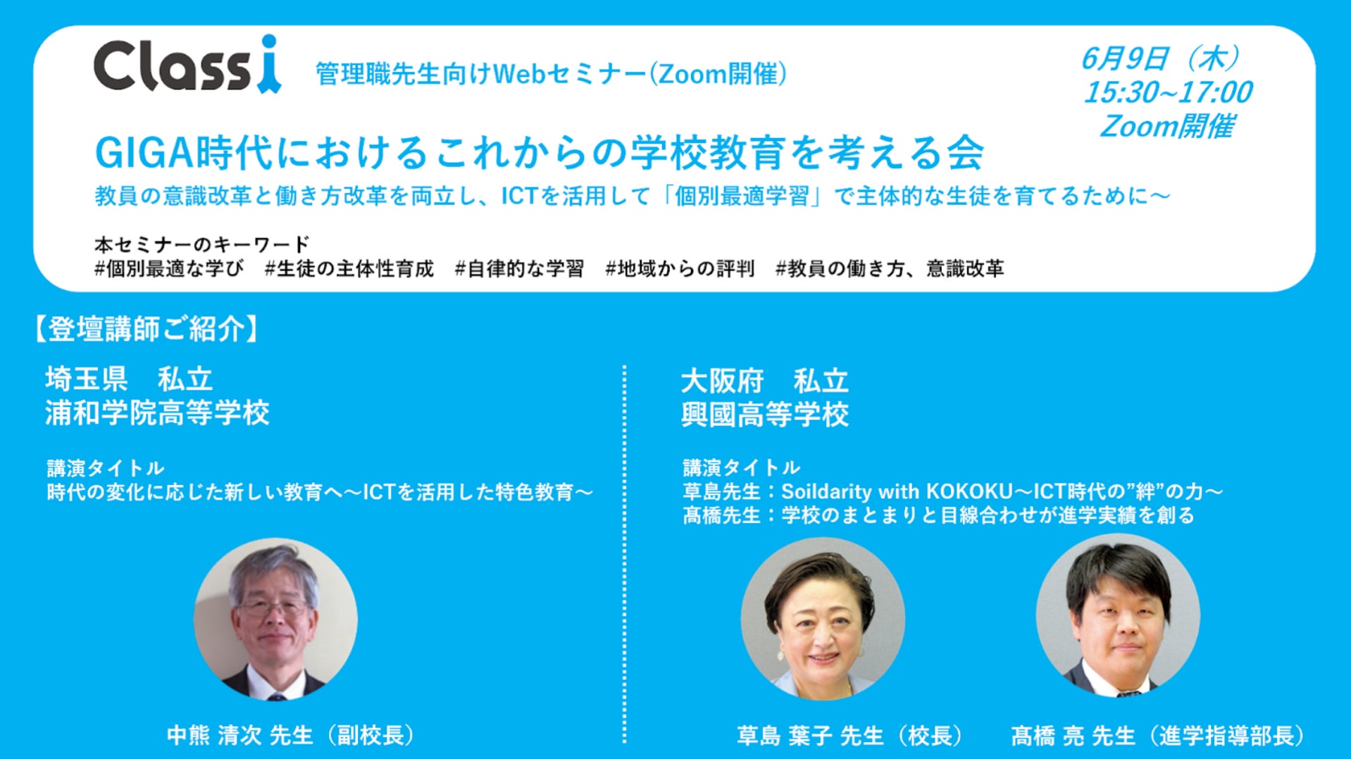 学校改革や校内のICT化を推進する上で肝になる組織作りや、個別最適な学びについて発信するセミナーです。奮ってご参加ください。