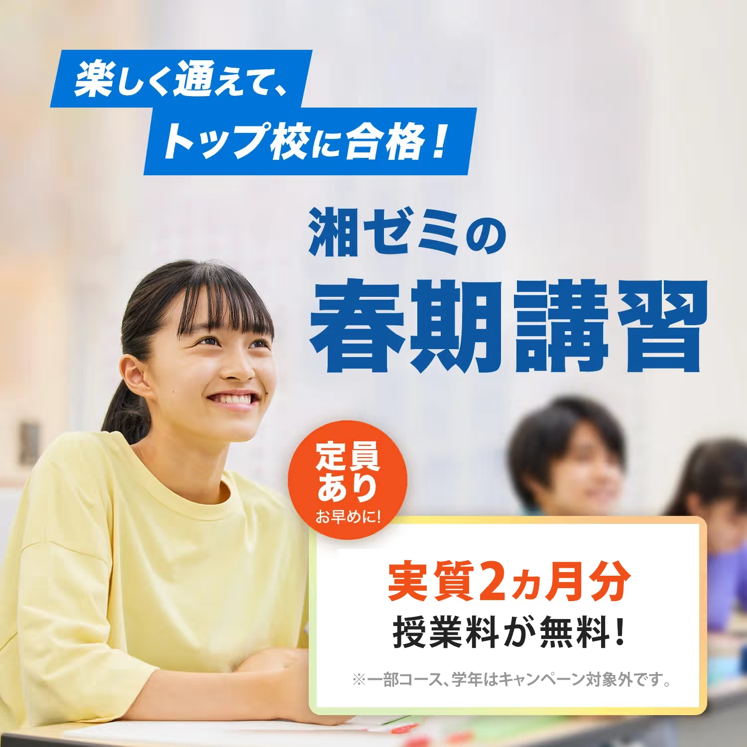 湘南ゼミナールでは新年度・春期の各講座の体験を受付中。コースにより、実質2カ月分の授業料が無料になるキャンペーンも実施中です。詳しくはこちらをご確認ください。