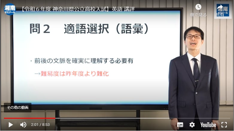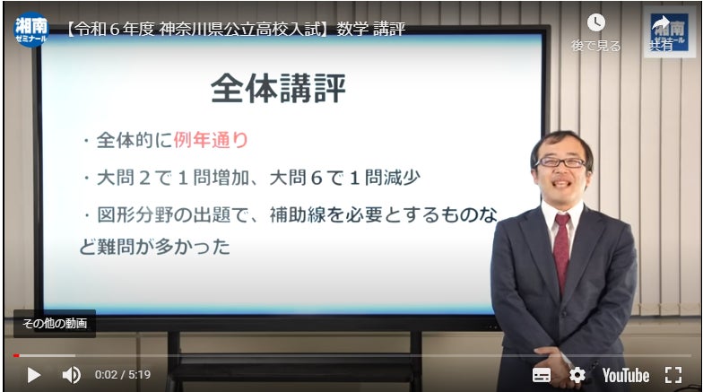 株式会社湘南ゼミナールは、公式ホームページや進路情報サイト・新聞等での入試問題講評の掲載に加え、新たに、精鋭講師陣による「入試解説動画」を神奈川県公立高校入試の当日(2月14日)に配信した。