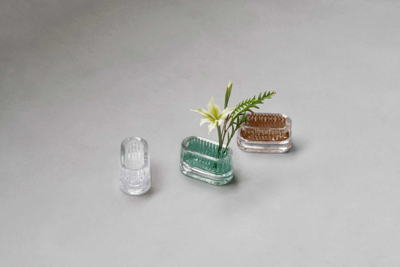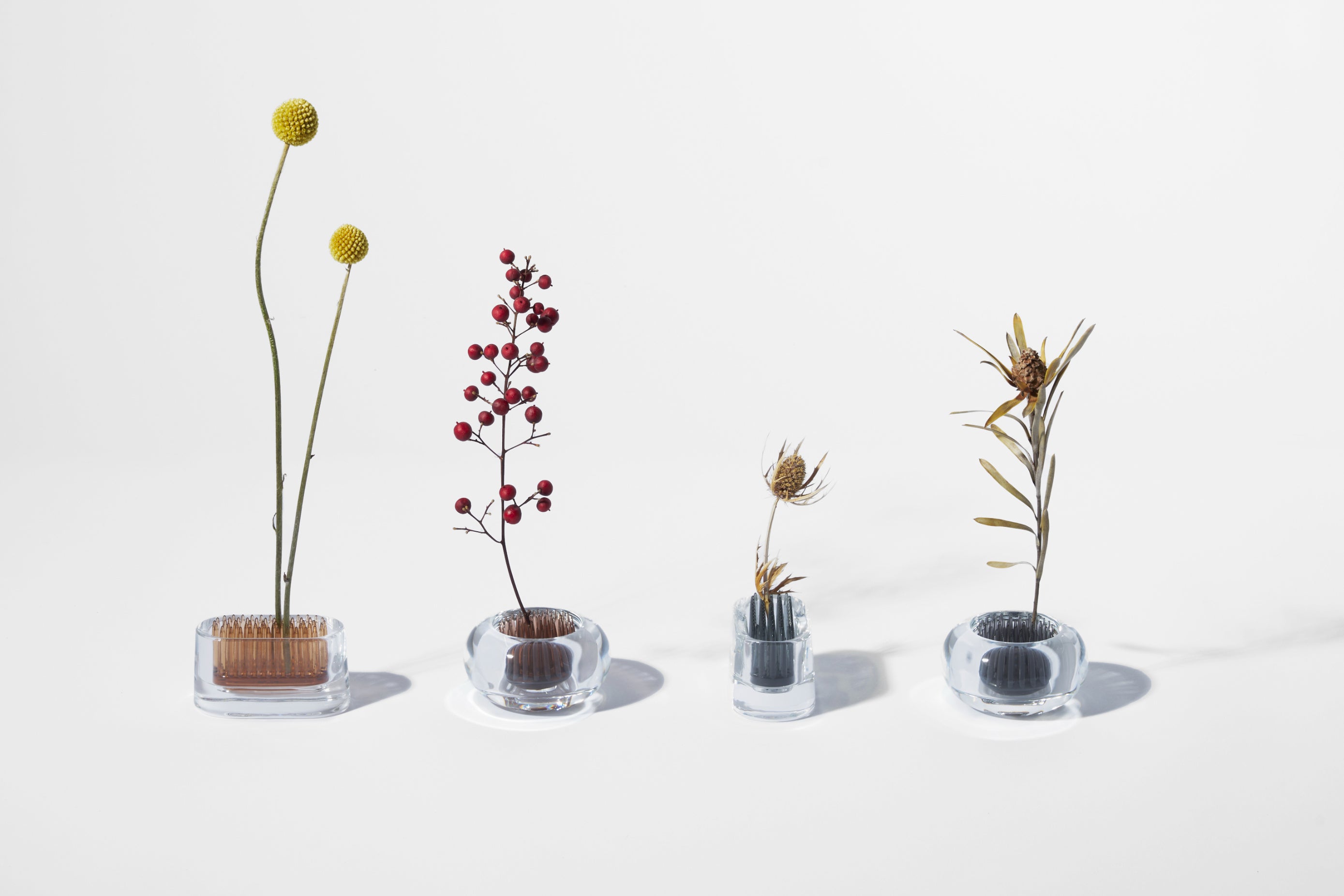 剣山の色は落ち着きのある宝石色からセレクトしました。剣山は茎の太さに合わせて挿せるので、大小様々な草花から枝物まで幅広い植物を生けられます。透明度の高いバリウムガラスはガラス職人によって、1つずつ手づくりされています。水を入れると空の状態とは異なる表情になり、透き通ったガラスに映る水と剣山が織りなす色合いが美しく花を引き立たせます。