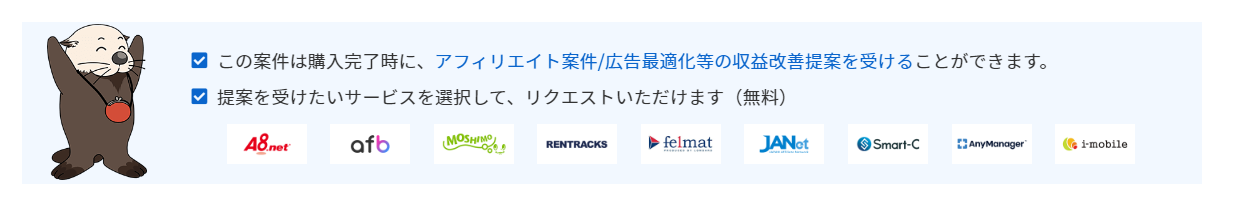 本機能は、ラッコM&Aで購入したWEBサイトに対して、当該WEBサイトにマッチしたアフィリエイト広告案件の提案をASPから受けられる、または収益改善の提案を提携パートナーから受けられる買主様用の機能です。アフィリエイトASP・WEBマーケティングサービスの提供会社様にご参画いただいています。