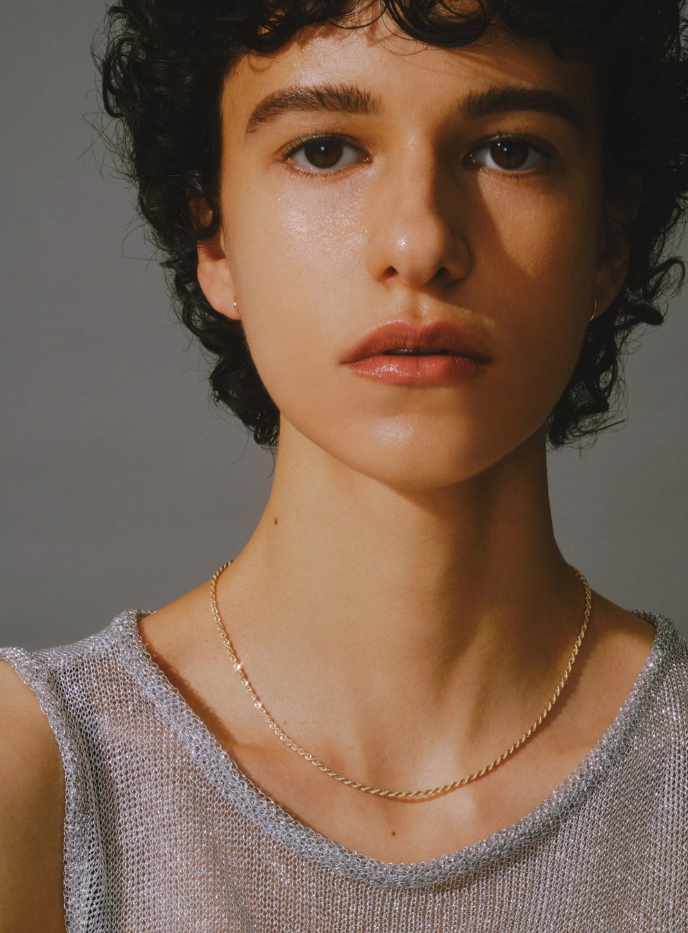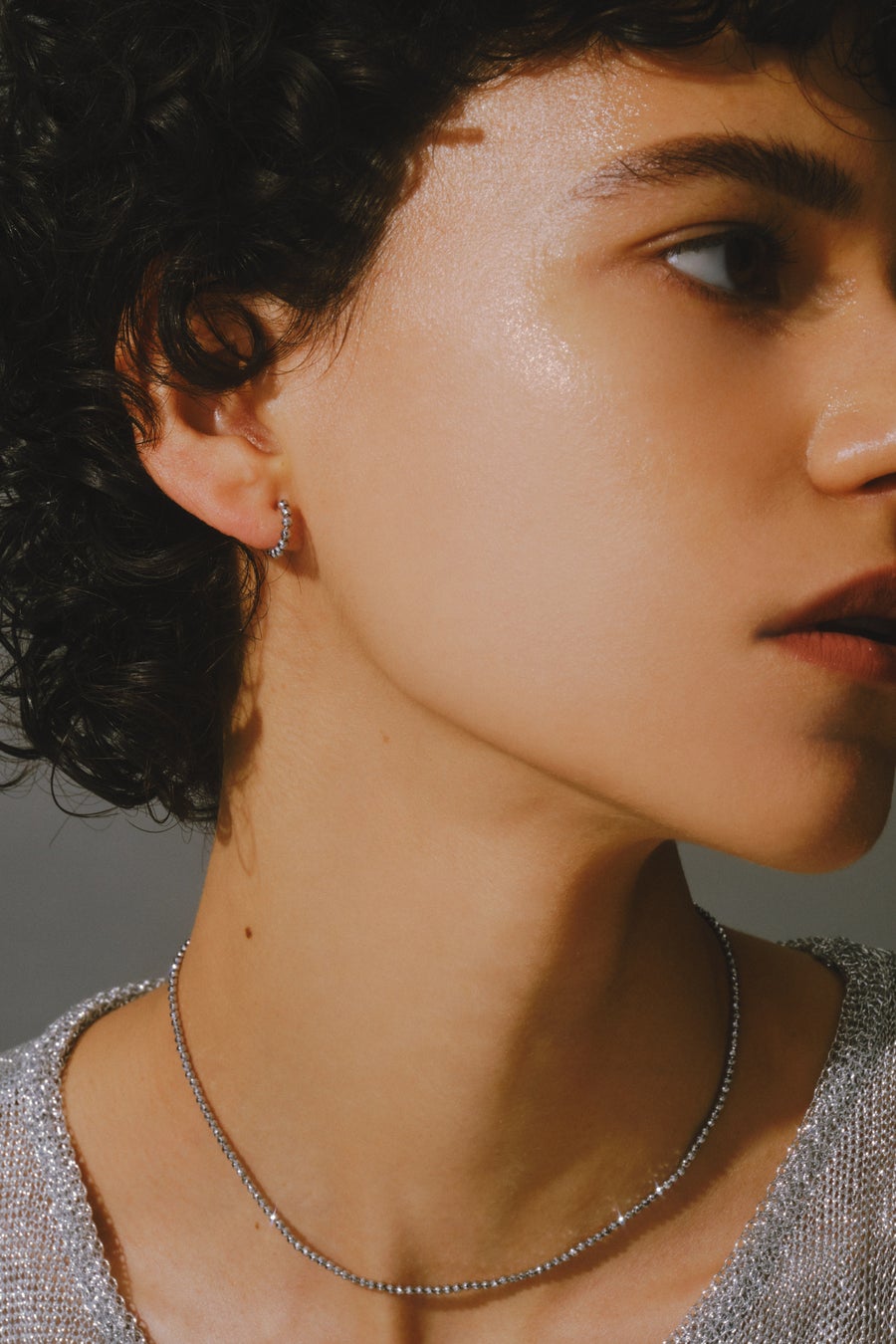 ヘマタイトのグレイッシュな輝きが、顔周りを柔らかに輝かせて、スタイリングを格上げします。