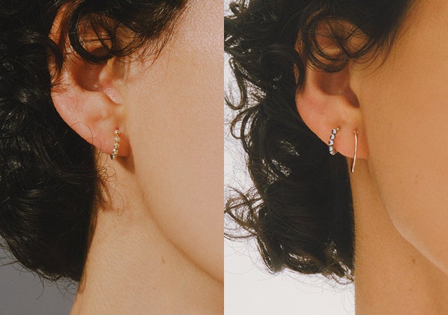 耳に添うように付けられる小振りなSサイズは、シンプルなピアスとのレイヤーで洗練された耳元に。