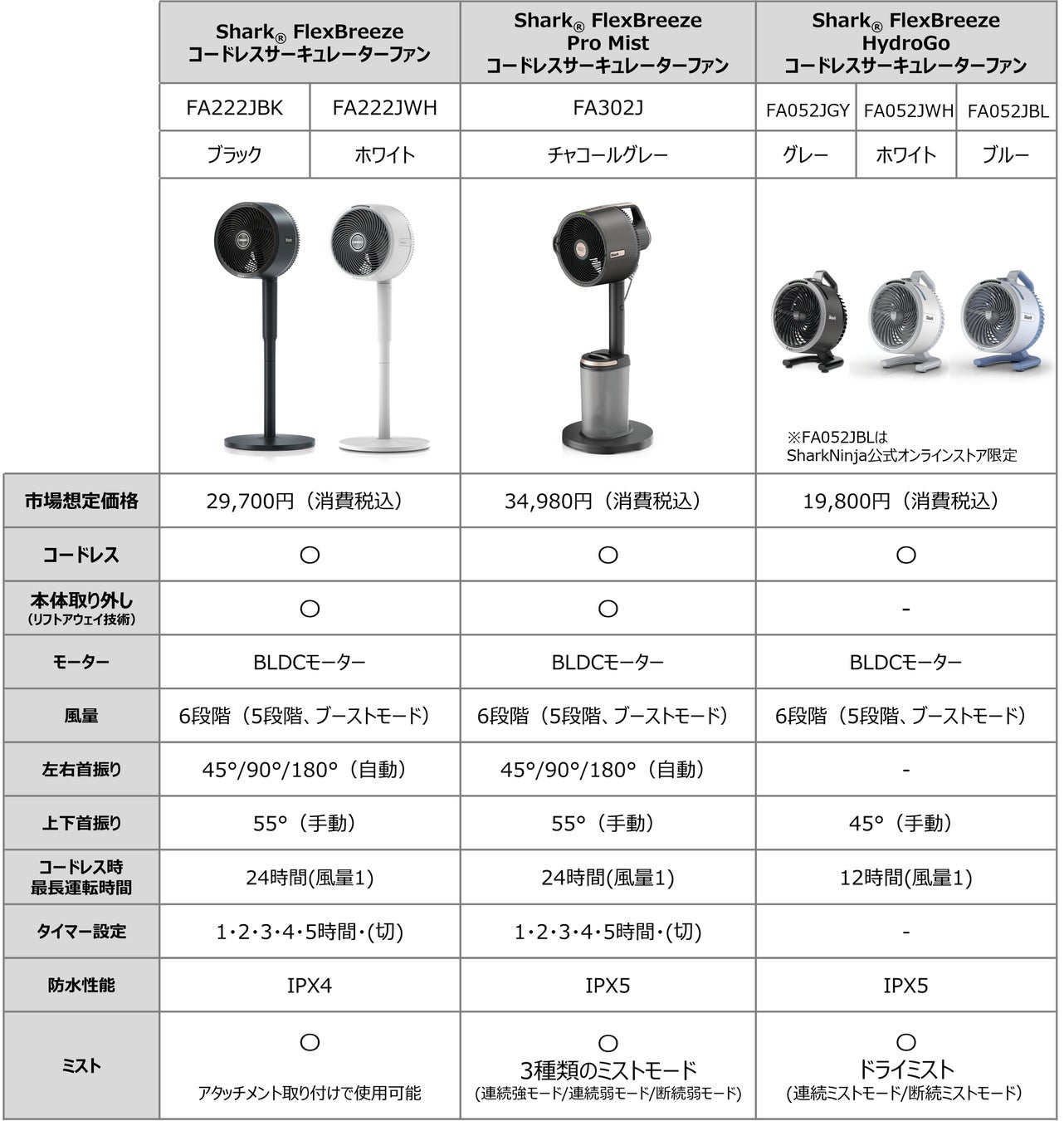 「Shark® FlexBreeze」シリーズ スペック比較表