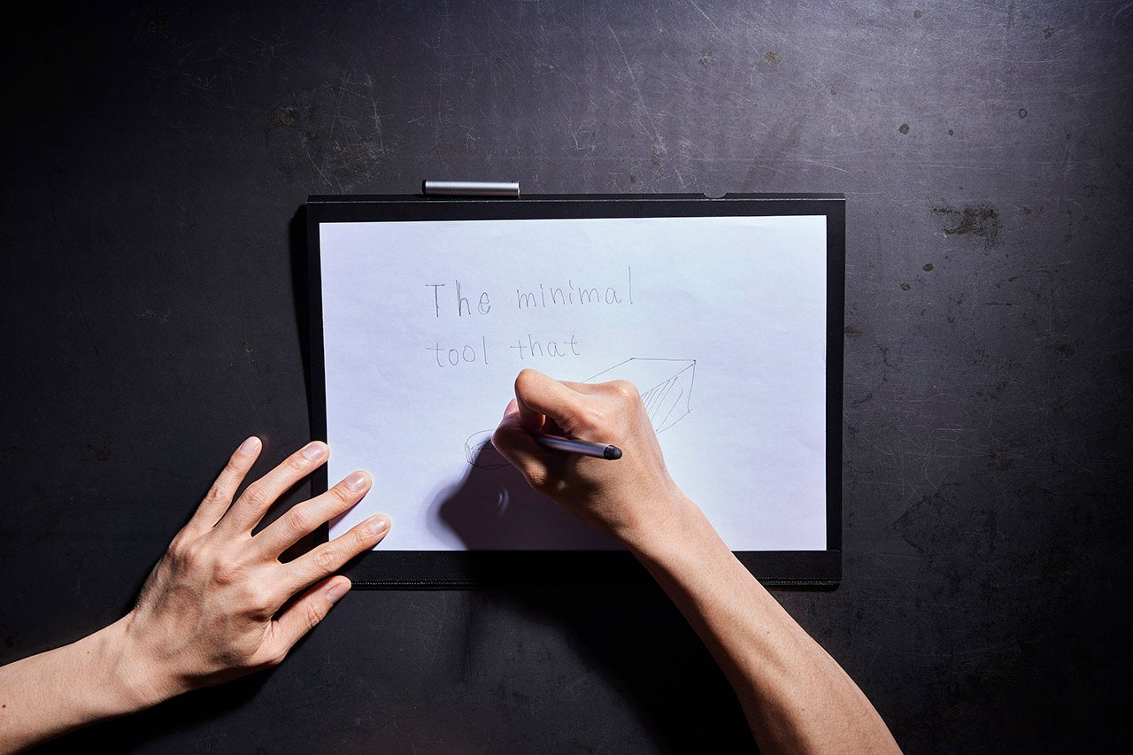 最高のアイデアを生むための最もミニマルなメモツール。ペンと A4用紙を装着して、ひらめいた瞬間にクルっと開くだけ。すぐ描きとめたいという衝動に、立ち上がり1秒で応えます。