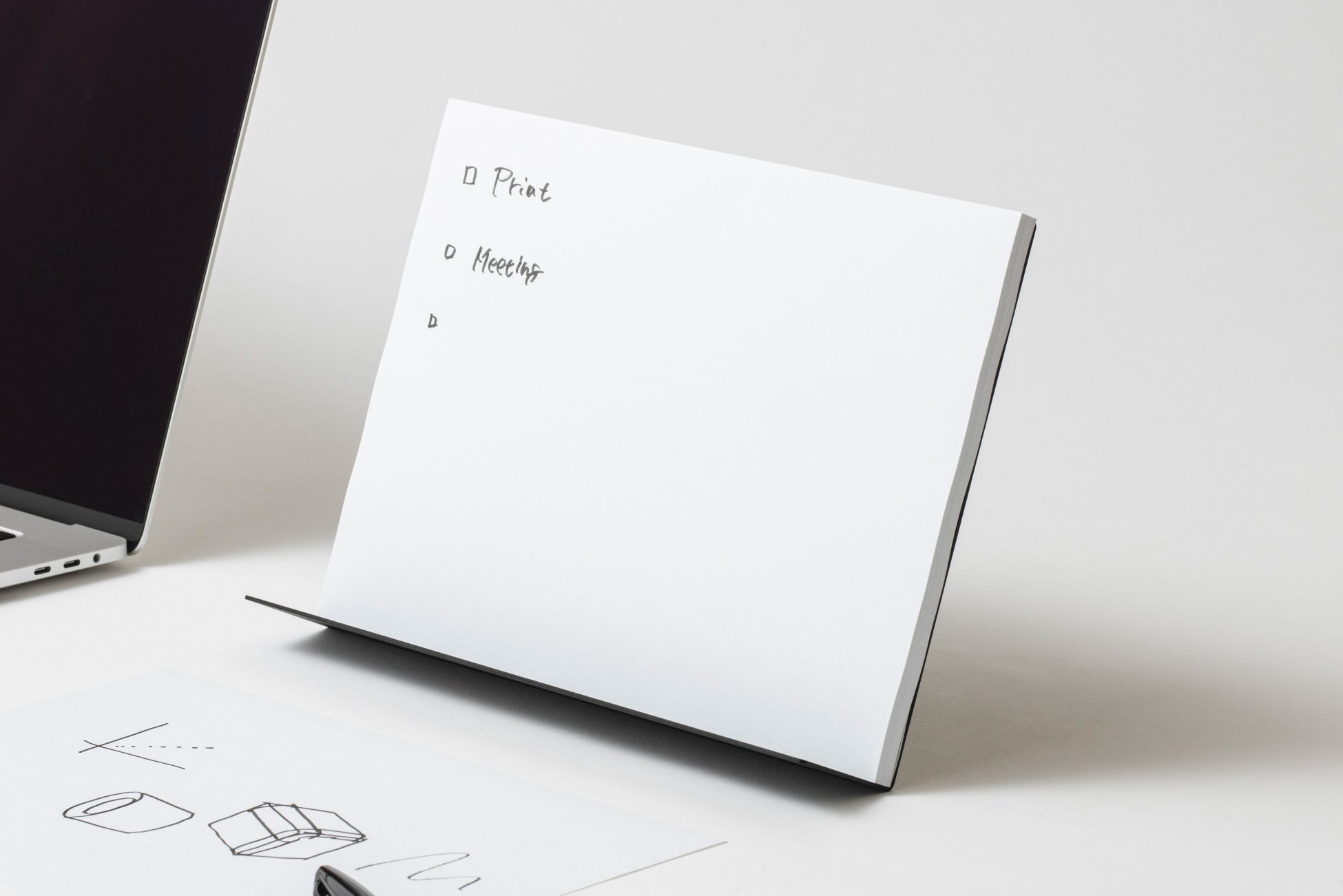 アイデアの源泉である真っ白なA4コピー用紙を、すぐに手が届く場所に大量にストックできて、メモやスケッチも気軽に立てておけるミニマルなペーパースタンド。