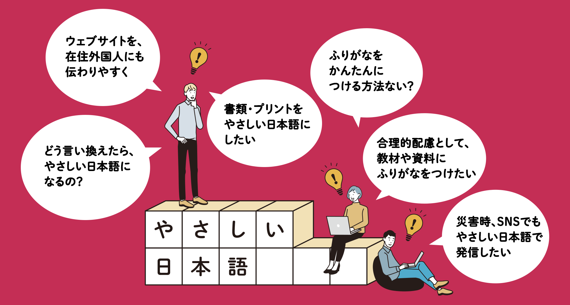 「やさしい日本語」とは、普通の日本語よりも簡単でわかりやすい日本語のことです。自治体・学校・医療機関などの多くの現場で、在留外国人をはじめ、高齢者や障害のある人への情報伝達やコミュニケーションに「やさしい日本語」が活用されています。
