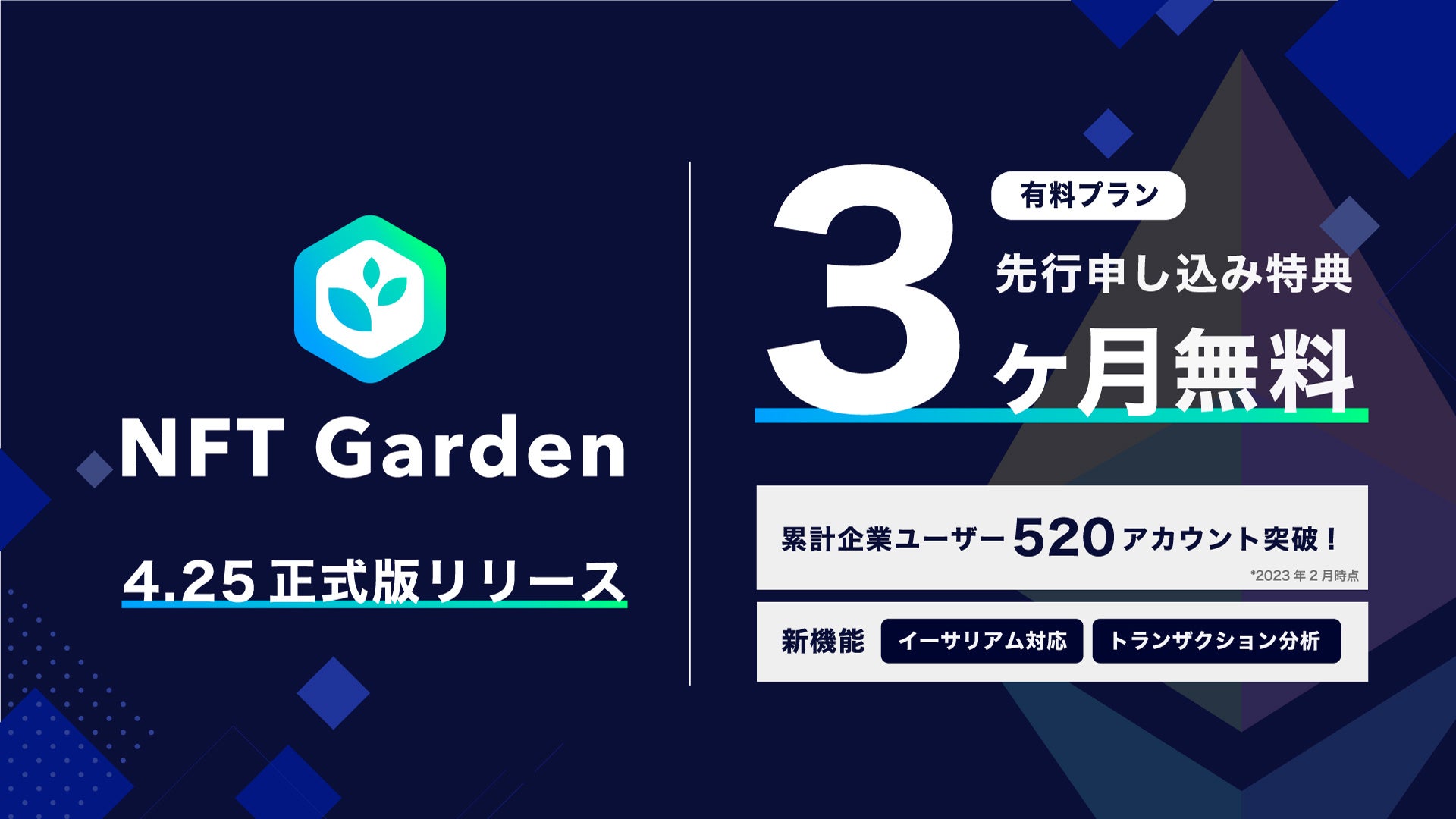 また、2022年1月からβ版としてサービス提供していたNFT Gardenは、2023年4月25日に正式版のサービスリリースする事を決定いたしました。正式版リリースを記念し先行込みユーザーには有料プランが3ヶ月間無料でご利用頂けるキャンペーンを行っております。