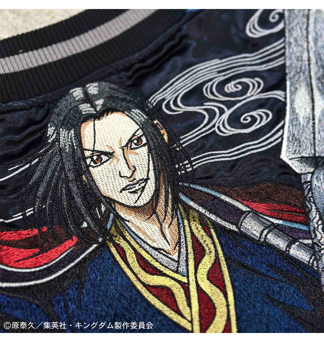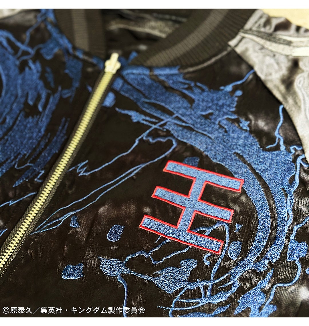 右袖には王騎の刺青を刺繍し、背面下部のブランドロゴを一刀両断。リバーシブル裏背面には王騎が残した名言が刺繍されています。