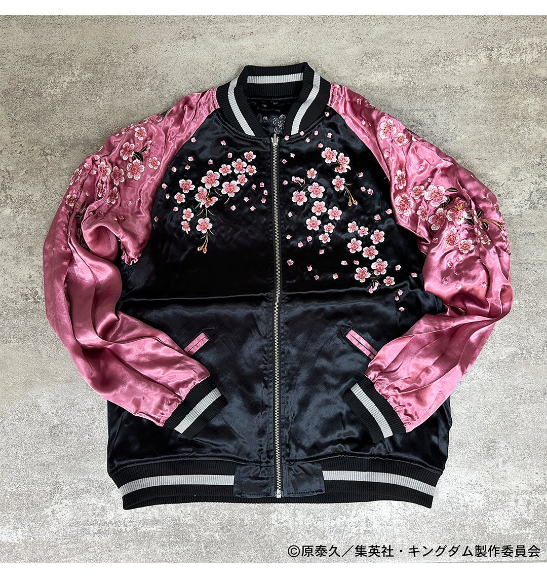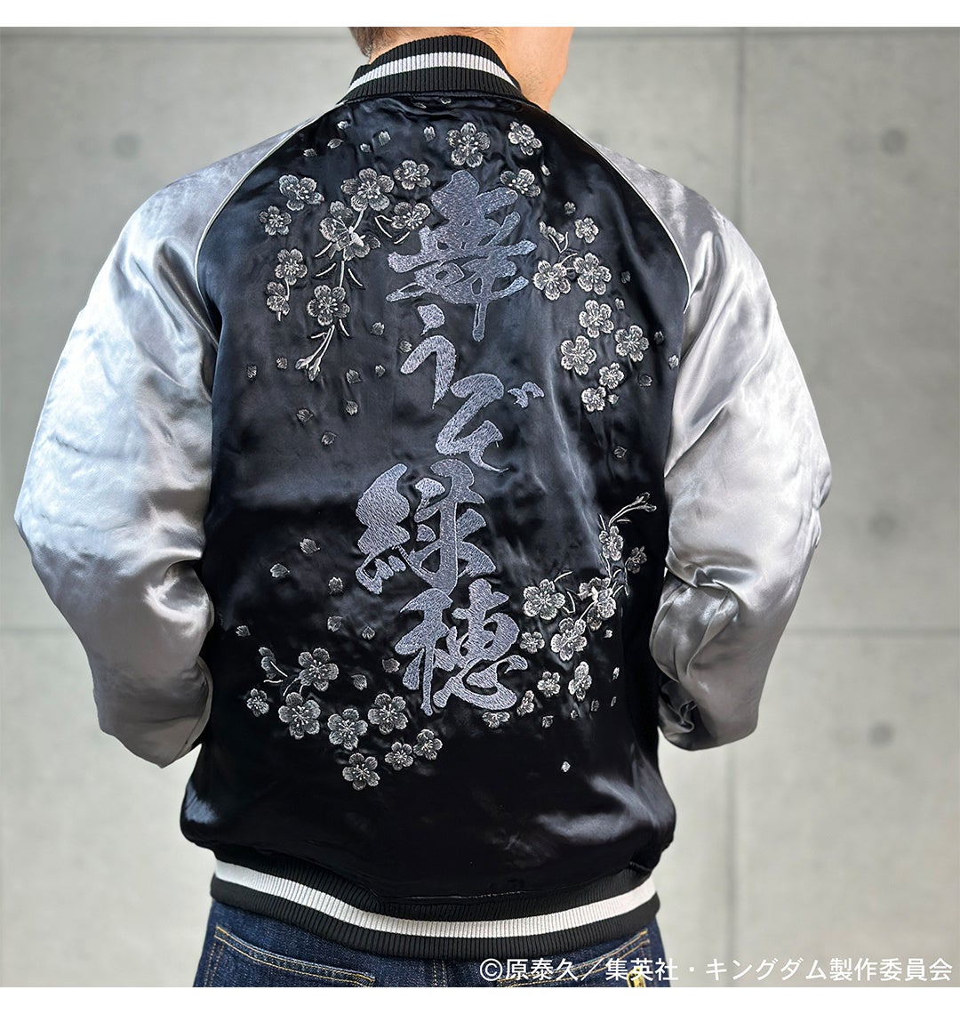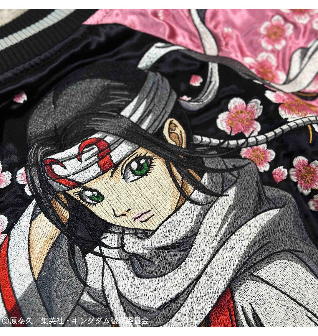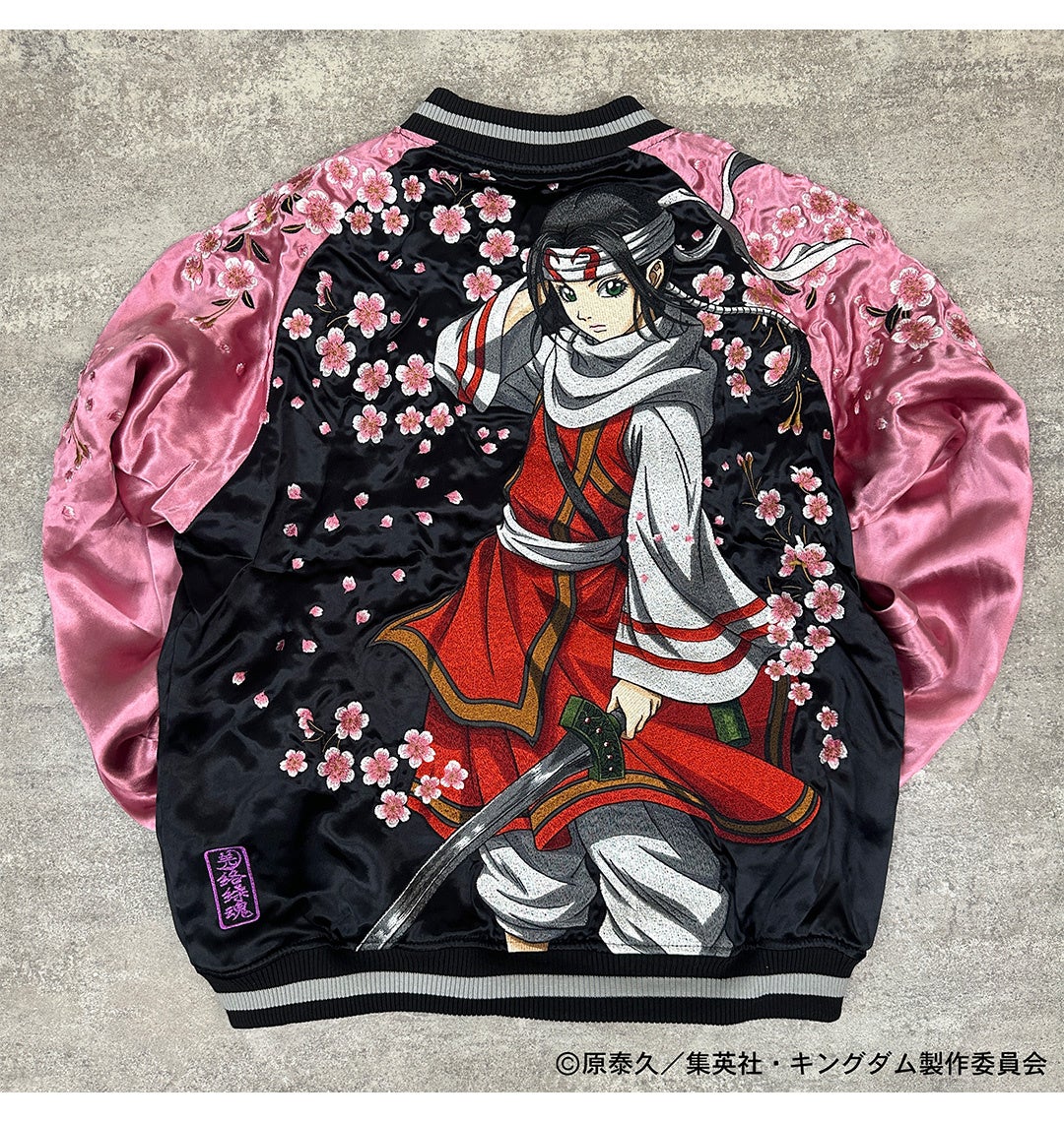 フロントには羌瘣が舞うように桜吹雪、バックには愛刀【緑穂】を刺繍。リバーシブル裏背面には羌瘣が残した名言が刺繍されています。
