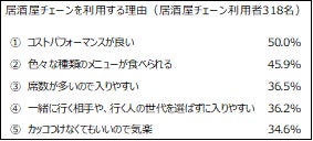居酒屋チェーンを利用する理由は、「コストパフォーマンスが良い」「色々な種類のメニューが食べられる」「席数が多いので入りやすい」「一緒に行く相手や、行く人の世代を選ばずに入りやすい」という点が上位に挙がりました。