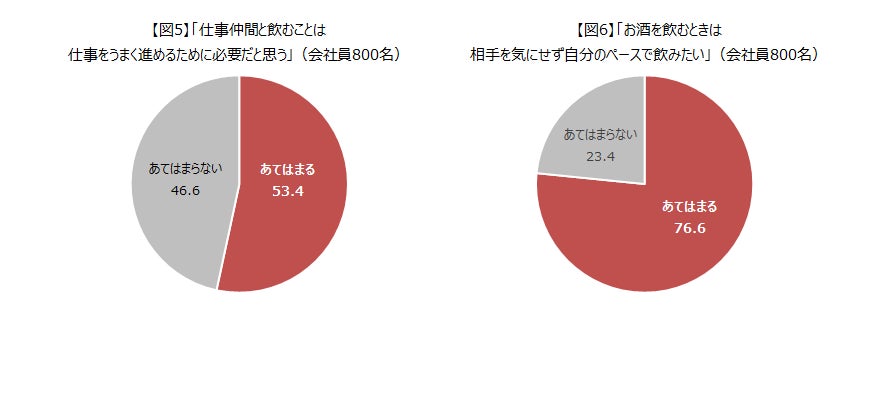 一方、76.6%の人は「お酒を飲むときは、相手を気にせず自分のペースで飲みたい」と回答(図6)。世代差があるかと思いきや、老若男女問わず同様の傾向のようです。