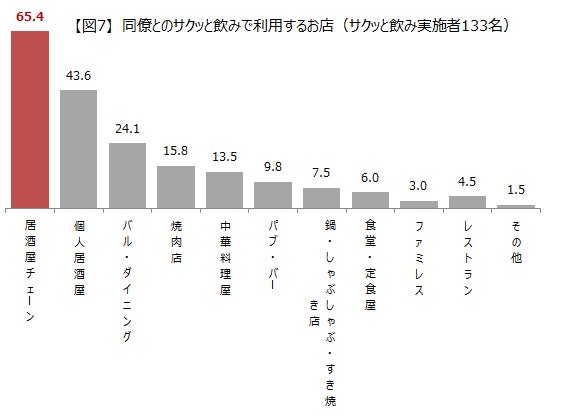「同僚や部下・上司のとサクッと飲み」で利用するお店を聞いたところ、65.4%の方が居酒屋チェーンを利用していることがわかりました。(図7)