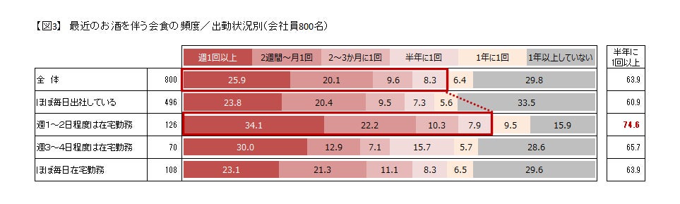 ウィズコロナで一気に広がった「在宅勤務」に関する調査では、「ほぼ毎日出社」が62%、「在宅または在宅併用」は38%。お酒を伴う会食頻度は、「週1~2日程度在宅」層が最も多い結果に(図3)。在宅勤務の中でも、「飲みにケーション」は継続されていることが伺える。