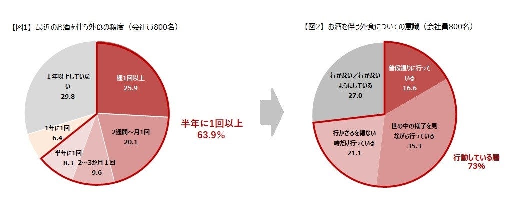 - 飲酒を伴う外食について、この半年で会社員の63.9%が実施。