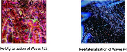 空中に浮遊する鏡面の彫刻が風景を切り取り、回転し人間の魂と風景の調和と変容を私たちに思い起こさせる作品をフィジカルに撮影した「Re-Digitalization of Waves」、その「Re-Digitalization of Waves」シリーズのデジタルと物質の間を繰り返し転移し続ける作品の過程で、あえてフレームレートゼロにし、質量性の高い 2.5 次元印刷に着地した「Re-Materialization of Waves」。そして新作となる「ヌル即是色色即是ヌル」は、般若心経の空のモチーフを銀彫刻のデジタルデータとして捉え直した作品です。