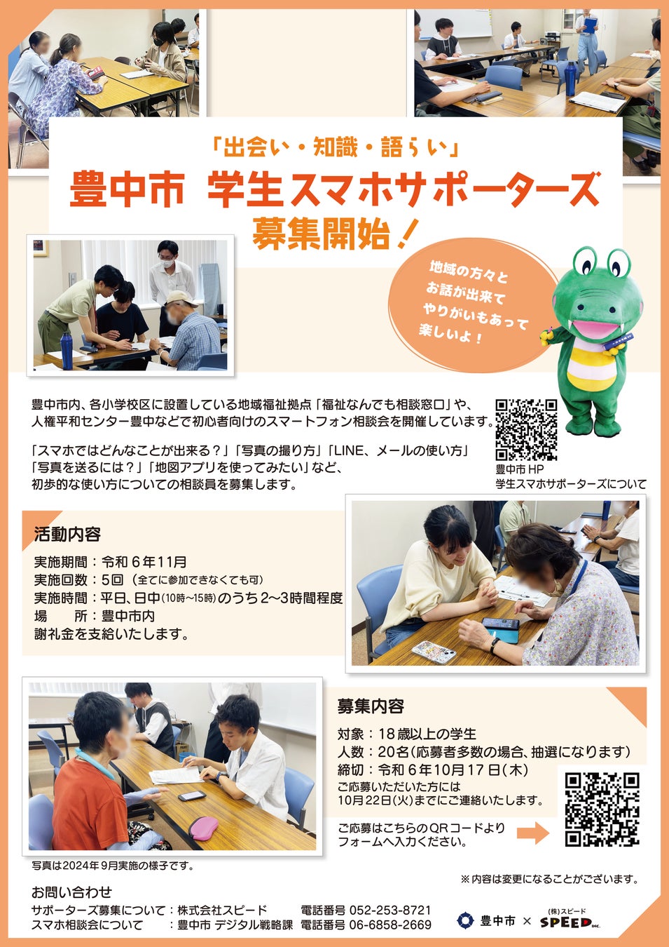 豊中市内校区で実施中の「初心者向けスマホ教室」相談員として、『学生スマホサポーターズ』を募集。(株)スピードによる学生連携の経験とノウハウを活かし、学生参加による事業の持続可能性について実証実験を行います。「スマホではどんなことが出来る?」「写真の撮り方」「LINE、メールの使い方」など、スマホの初歩的な使い方に対応するだけではなく、学生と地域とのつながりによって生まれる世代間交流、地域活性化にも期待します。