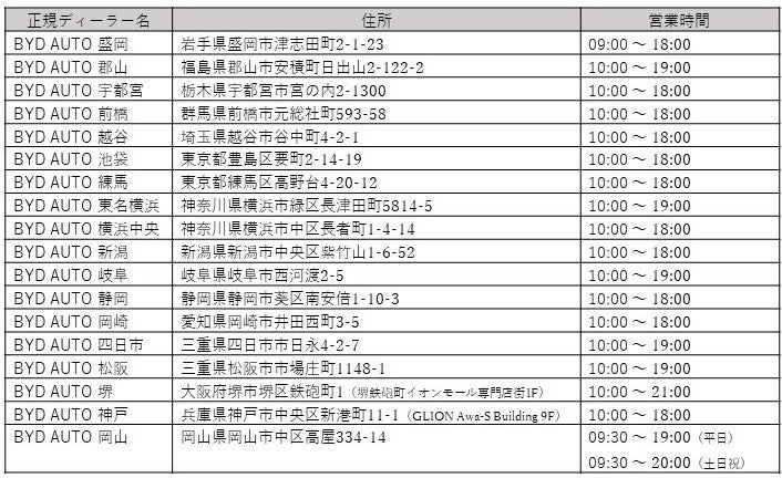 ■受付可能なBYD AUTO正規ディーラー 一覧(2023年5月19日時点)