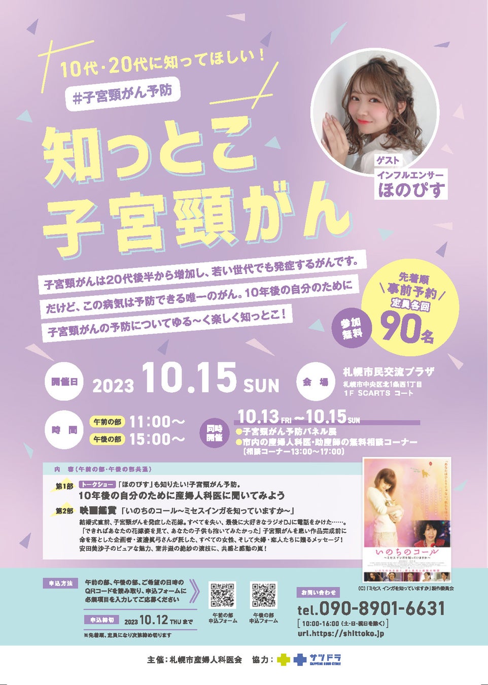 札幌市産婦人科医会が主催する本イベントでは「子宮頸がんの予防についてゆる〜く楽しく知っとこ!」というコンセプトのもと、午前・午後の部に分かれて、子宮頸がんに関連したトークショーと映画鑑賞会が行われます。