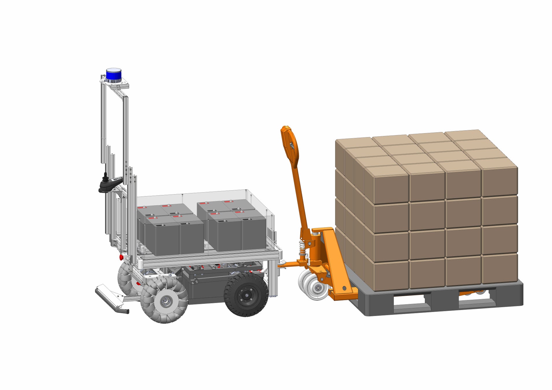 以下の図が推奨されるカスタマイズの一例です。荷台の上には電池を増設することで運用に十分な稼働時間と牽引物に対するカウンターウェイトを兼ねており、ハンドパレットトラックに積まれた重量物を低い連結位置でサウザージャイアントに接続して牽引している様子です。
