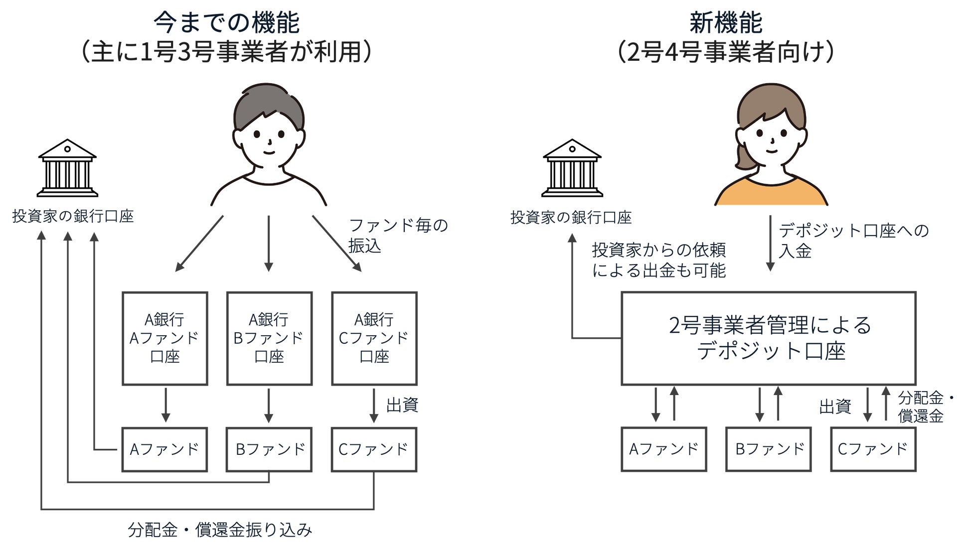 新たに導入された機能により、投資家の資金の預託が可能な2号及び4号事業者にとって、当プラットフォームの使い勝手がさらに向上します。今回の拡張機能では、投資家ごとの預託金口座(デポジット口座)により、残高管理が行えるようになります。これにより、投資申込前に資金の入金を完了させ、デポジット口座の残高を使用して投資を行うことが可能となり、申込後の未入金の発生を防止できます。